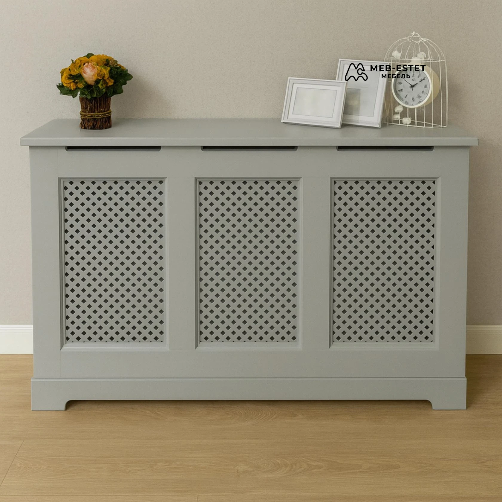 Тумба-экран для батареи с аккуратной перфорированной фасадной решёткой, изготовленная по индивидуальным размерам. Идеально скрывает радиатор, не нарушая воздухообмена и эстетики интерьера.