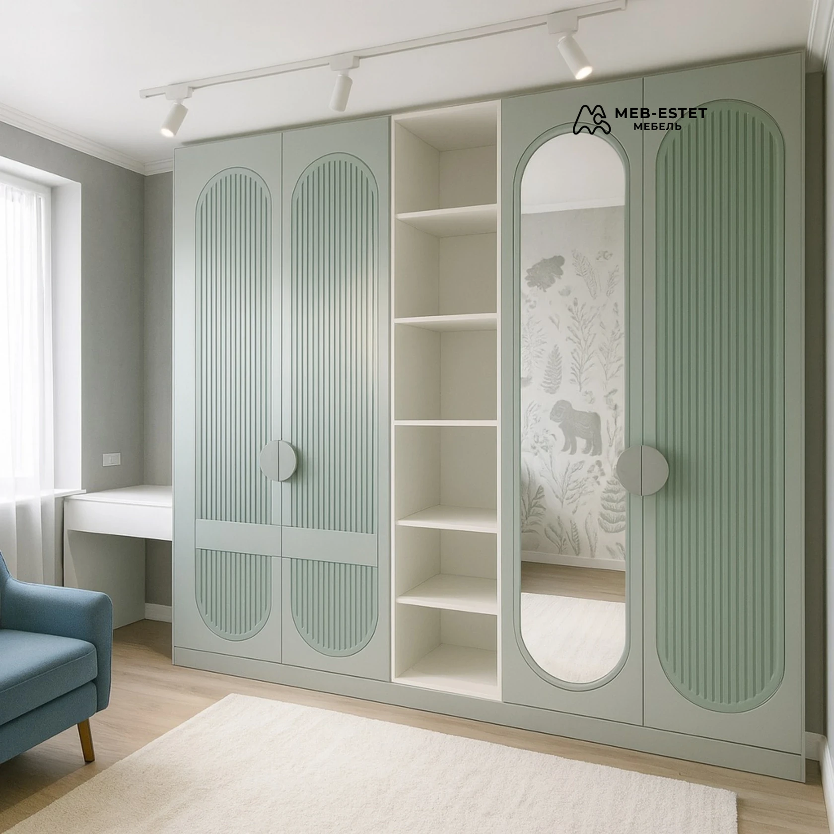 Авторский корпусный шкаф-гардероб премиум-класса — сочетание фрезерованного МДФ в эмали и цельного зеркала. Центр гостеприимно оформлен открытыми полками, внутри — продуманная планировка под штанги, ящики и бельевые отделения. Используем скрытые петли, качественные направляющие и усиленные полки для равномерной нагрузки. Идеален для детской или спальни, долговечен при регулярной эксплуатации.
