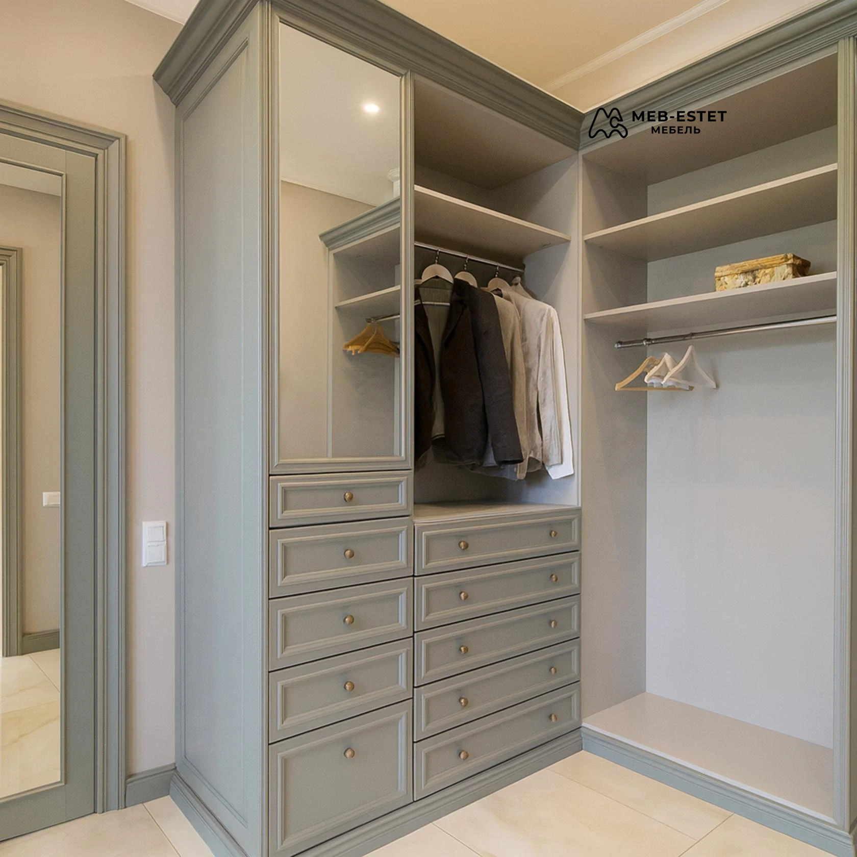 Классическая гардеробная на заказ для прихожей. Выполнена из окрашенного МДФ с филёнчатыми фасадами, матовой поверхностью и золотистыми ручками. Включает высокий пенал со вставкой-зеркалом, ряд глубоких выдвижных ящиков и открытые секции со штангами.
