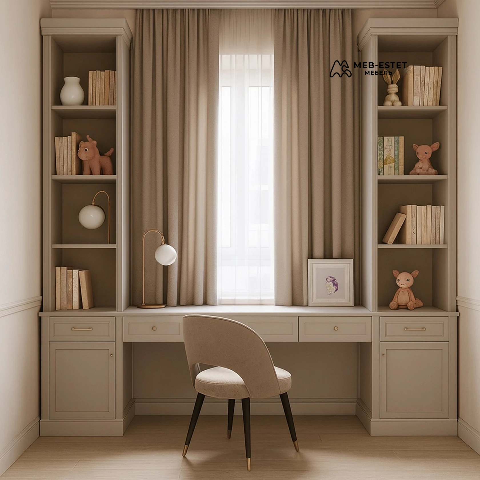 Изящная встроенная рабочая зона под окном в неоклассическом стиле. Матовая окраска и фрезерованные фасады создают сдержанную премиальную эстетику, а встроенные пеналы по краям дают вместительные открытые полки и закрытые отсеки.