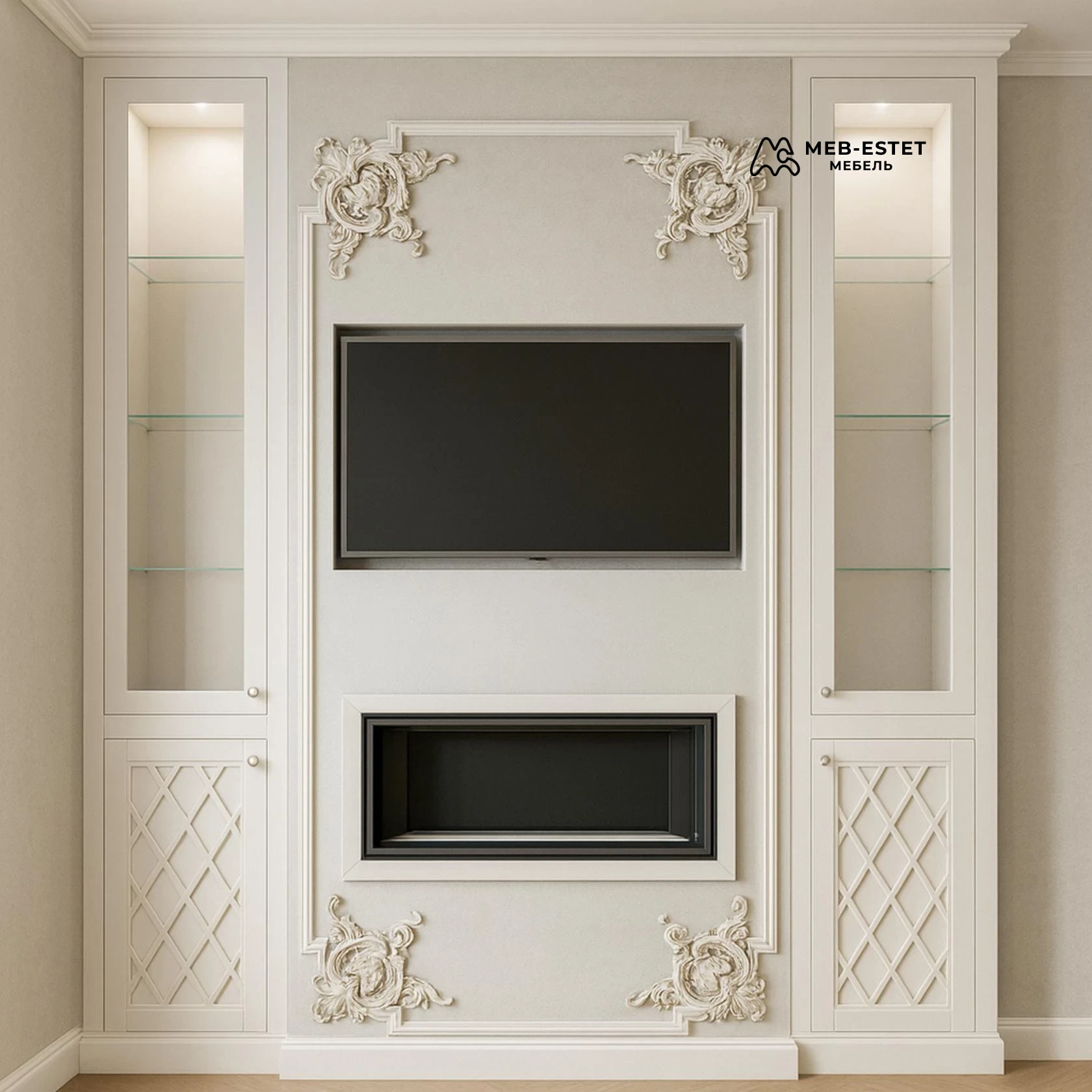 Элегантная встроенная стенка в неоклассическом стиле с нишей под ТВ и камин, выполненная по индивидуальным размерам. Корпус и фасады — окрашенный МДФ с фрезеровкой и филёнками, боковые витрины со стеклянными полками и подсветкой.