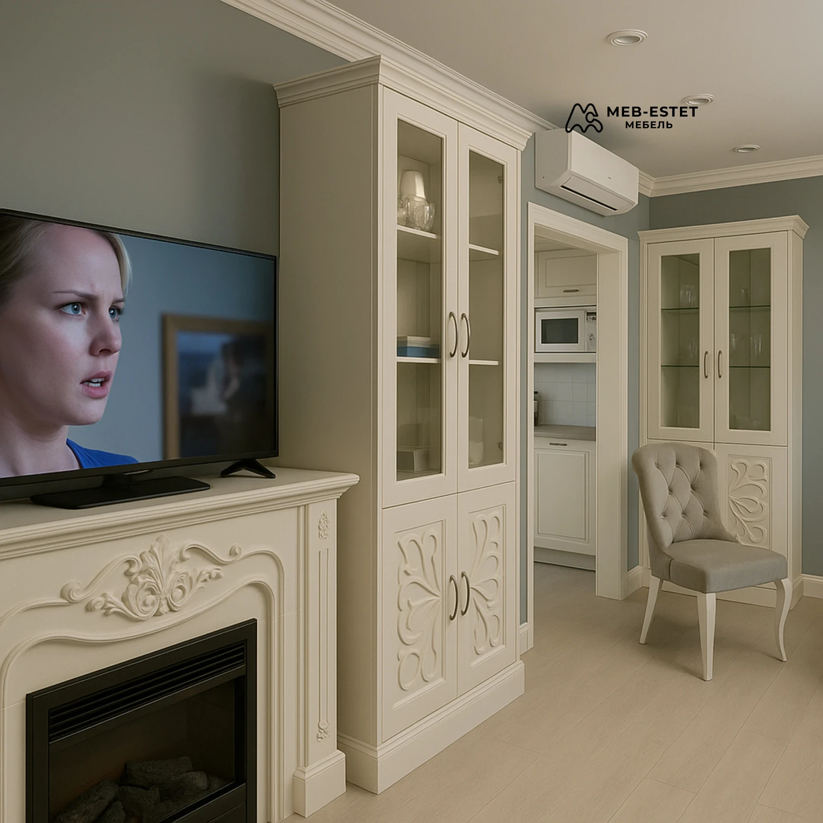 Элегантная корпусная стенка в неоклассическом стиле — решение для тех, кто ценит премиальную отделку и функциональность. Модель выполнена в кремовом эмалевом покрытии на основе МДФ, с витринными верхними секциями и резными филёнками в нижних дверцах.