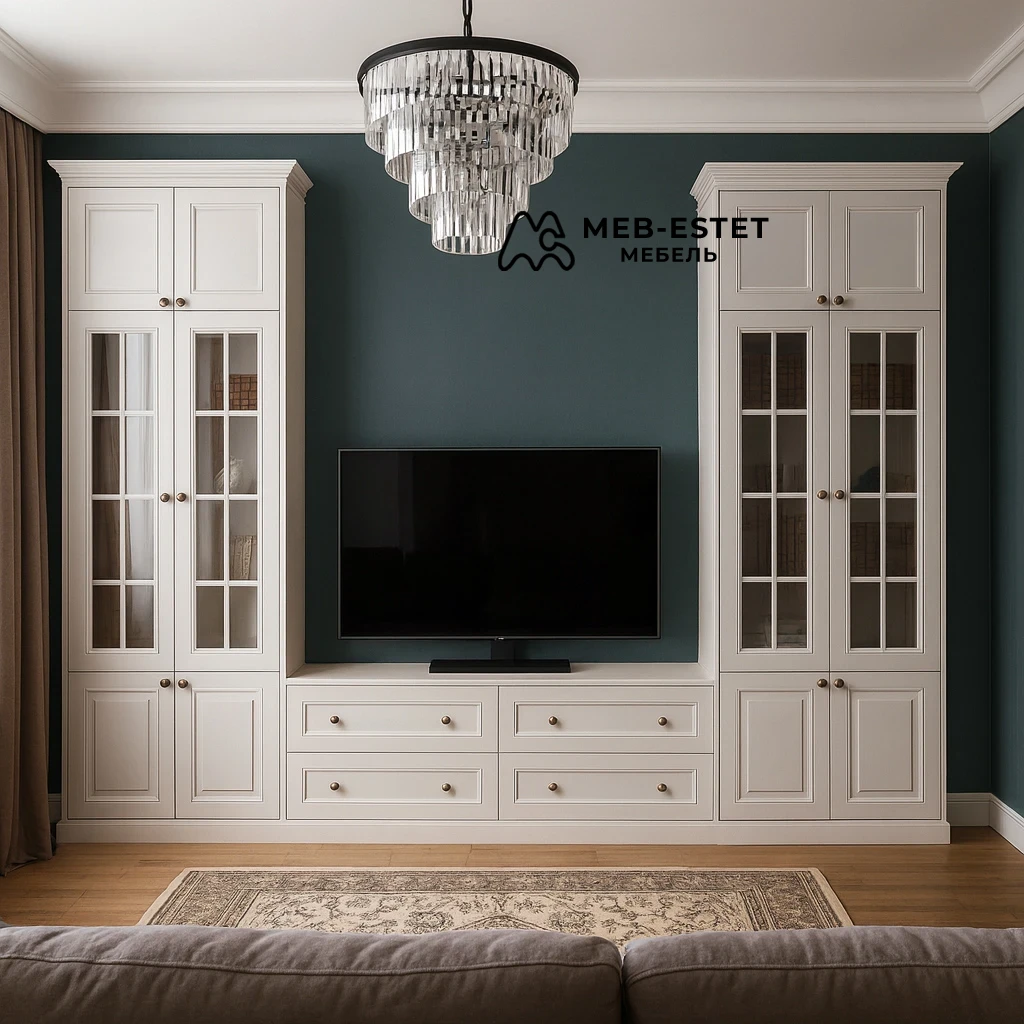 Элегантная корпусная стенка в неоклассическом стиле с двумя высокими витринами и низким тумбовым блоком под ТВ. Выполнена из крашеного МДФ с филенчатыми фасадами, декоративным карнизом и переплетными стеклами — сочетание эстетики и функциональности.