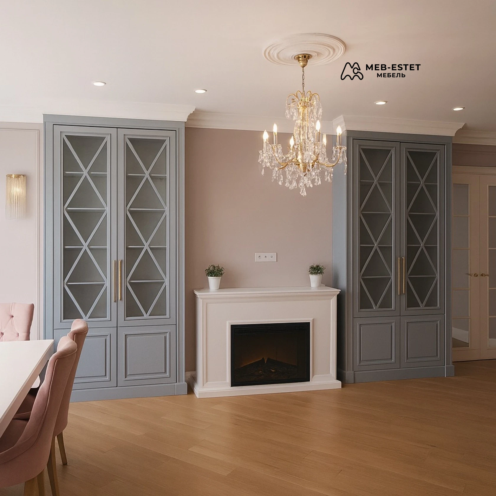 Парная корпусная витрина неоклассического характера — премиальное решение для гостиной. Корпус из МДФ с покраской, фасады — стекло с декоративной раскладкой «X» и филёнками внизу. Внутри регулируемые полки, возможна интегрированная подсветка и мягкое закрывание дверей.