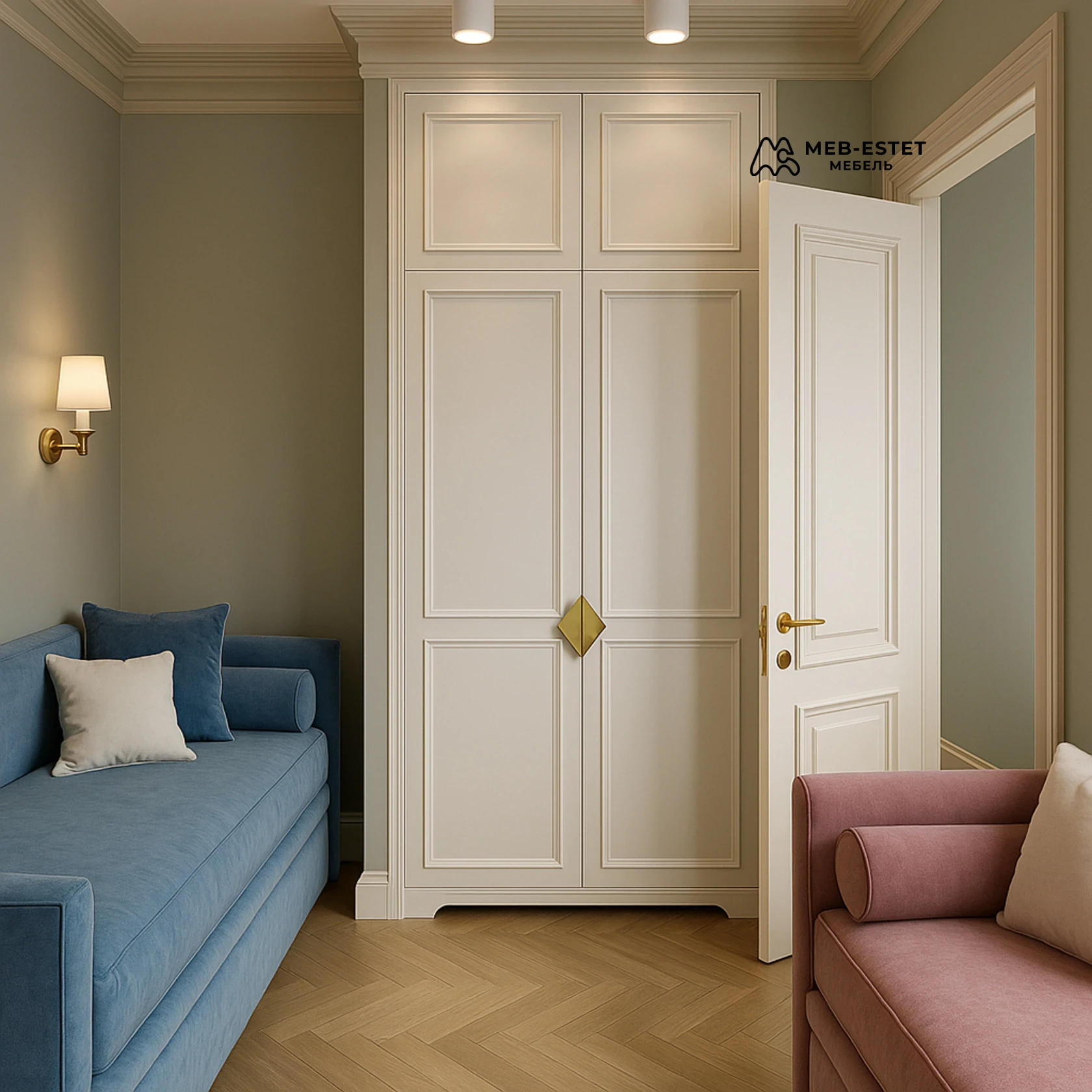 Классический корпусный шкаф с распашными дверцами и верхними антресолями. Выполнен из МДФ с эмалевым покрытием, фасады — фрезерованные филёнки и декоративные пилястры, латунная ручка добавляет акцент. Эстетика неоклассики, мягкий кремовый тон.