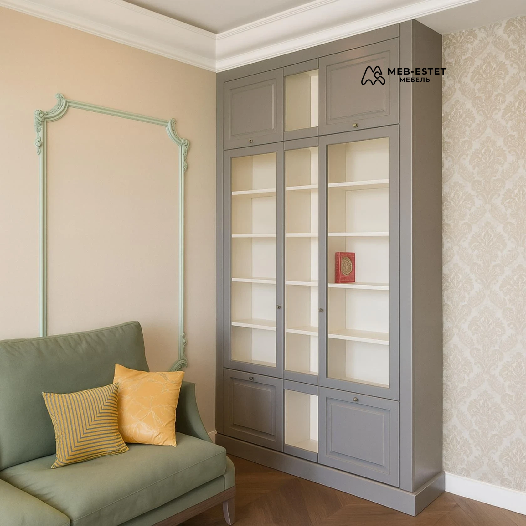 Классическая шкаф‑витрина из премиальной серии, исполнение на заказ. Корпус и филёнчатые фасады — крашеный МДФ, дверные вставки — прозрачное стекло, внутренний цвет светлый для эффектной экспозиции предметов.
