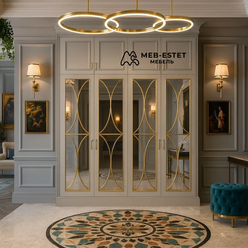 Классический шкаф с зеркальными распашными дверями и декоративными радиальными накладками. Карниз и рама оформлены резьбой, фасады — зеркало с фацетом и легкой патиной, корпус — шпон/массив. Выполняется по индивидуальным размерам, с продуманной внутренней планировкой.