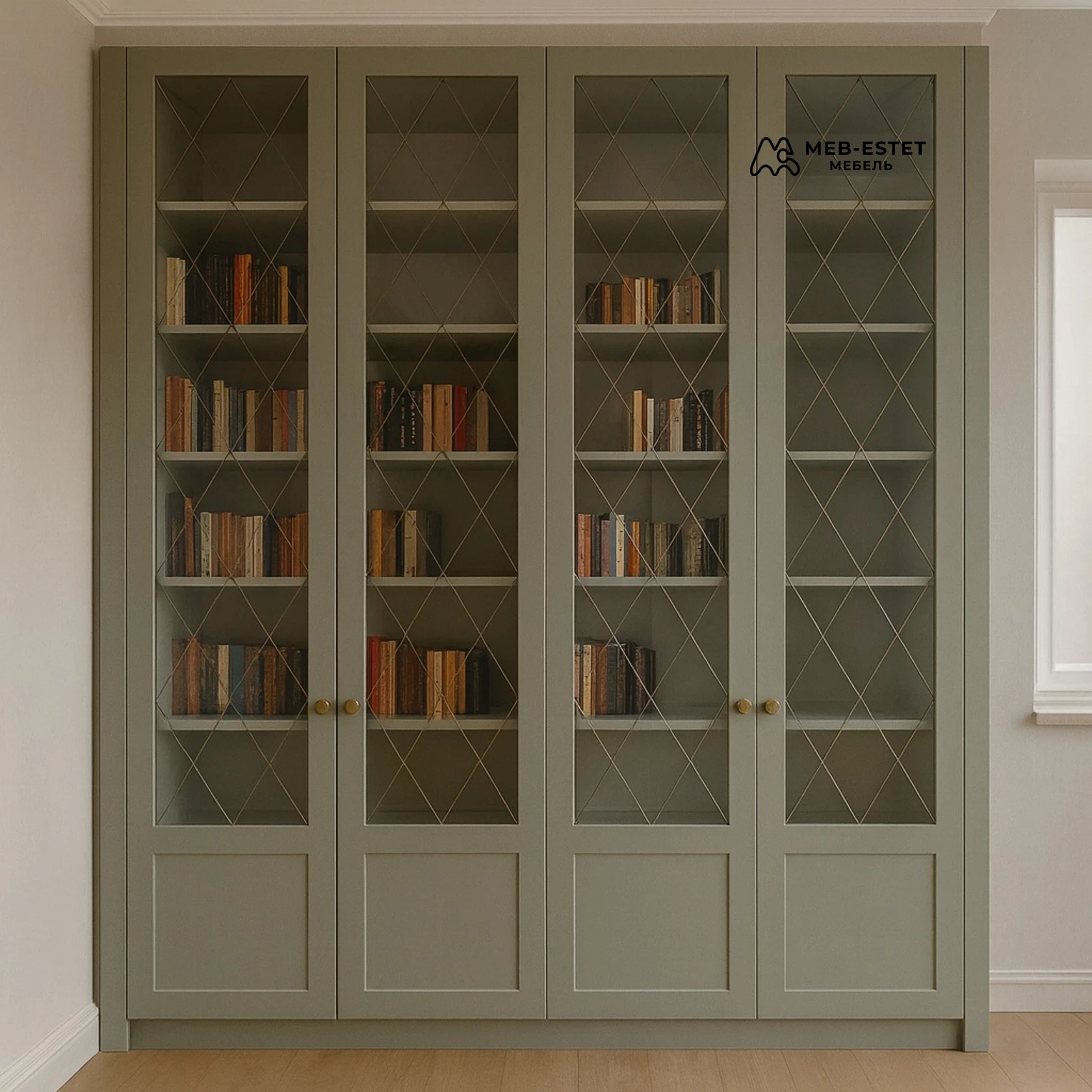 Элегантный встроенный книжный шкаф‑витрина в неоклассическом стиле. Фасады из МДФ с матовой эмалью и витражным стеклом с ромбовидной раскладкой создают благородный, спокойный интерьер. Удобные регулируемые полки выдержат коллекцию книг и декоративные предметы, а латунные ручки подчеркивают премиальный характер.