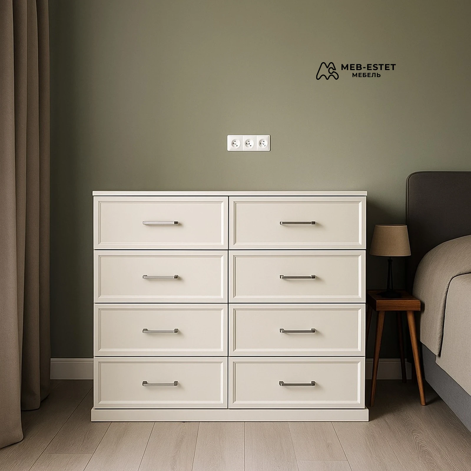 Классический корпусный комод в кремовом цвете с восьмью выдвижными ящиками. Фасады — фрезерованная панель из МДФ с матовой эмалевой отделкой, корпус — качественная ламинированная плита. Ящики на металлических направляющих полного выдвижения с доводчиками, ручки хромированные. Конструкция продумана для регулярной эксплуатации: усиленное дно ящиков и цокольная опора.