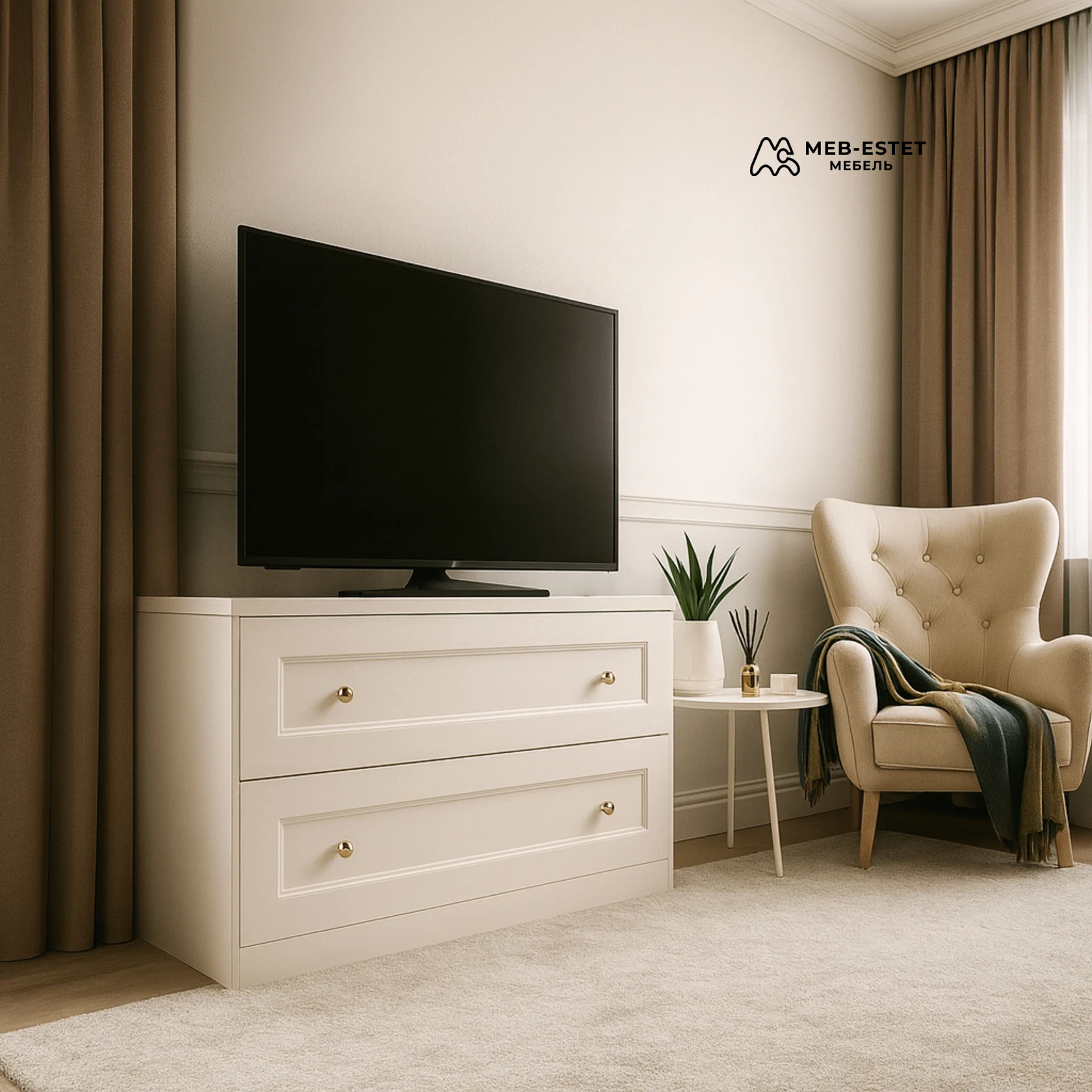 Классический комод под телевизор с двумя крупными выдвижными ящиками — аккуратное исполнение в кремово-бежевой гамме. Фасады с неглубокой фрезеровкой и декоративной рамкой, круглые металлические ручки позолоченного оттенка добавляют элегантности.