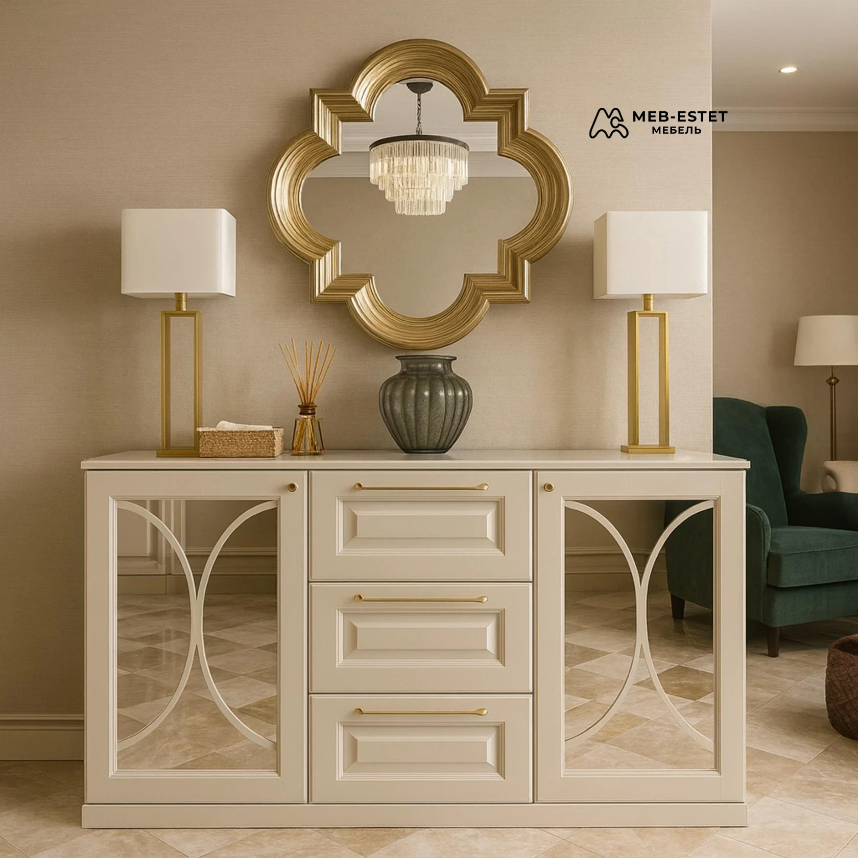 Премиальный кремовый комод с витриной — элегантное решение для гостиной или прихожей. Корпус выполнен из МДФ с эмалевым покрытием, боковые дверцы вставлены стеклом с декоративной раскладкой. Акцент — профилированные фасады и латунные ручки.