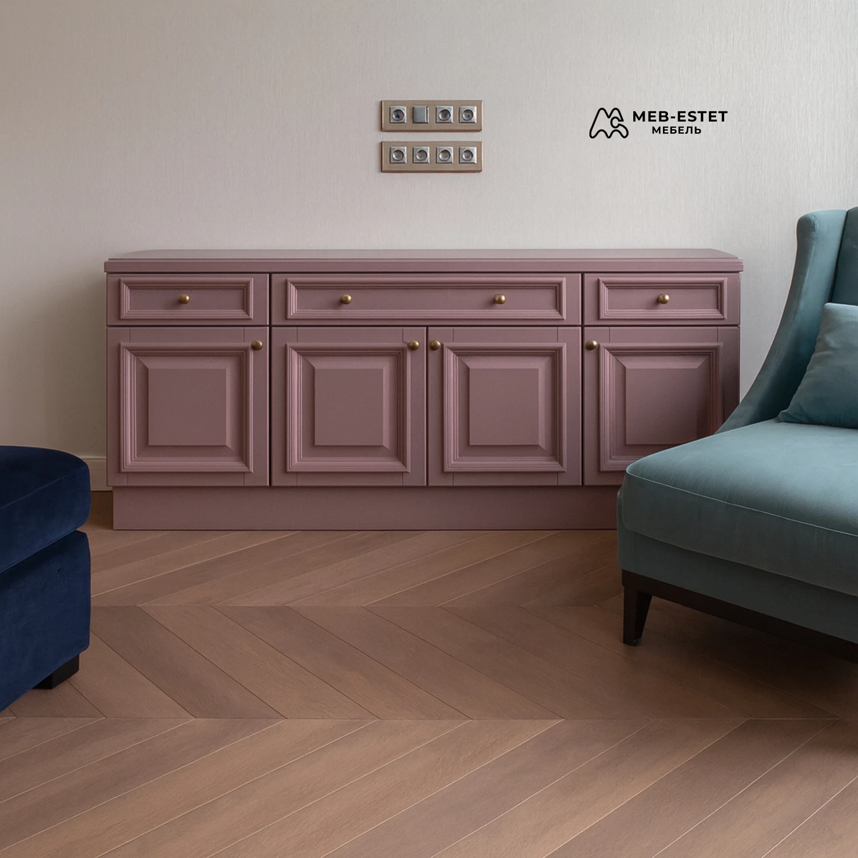 Комод в неоклассическом стиле с фрезерованными филёнками и матовой эмалью. Корпус выполнен из МДФ, окрашенный в глубокий розовый тон; рукояти — латунного цвета, столешница усилена для повседневной эксплуатации.