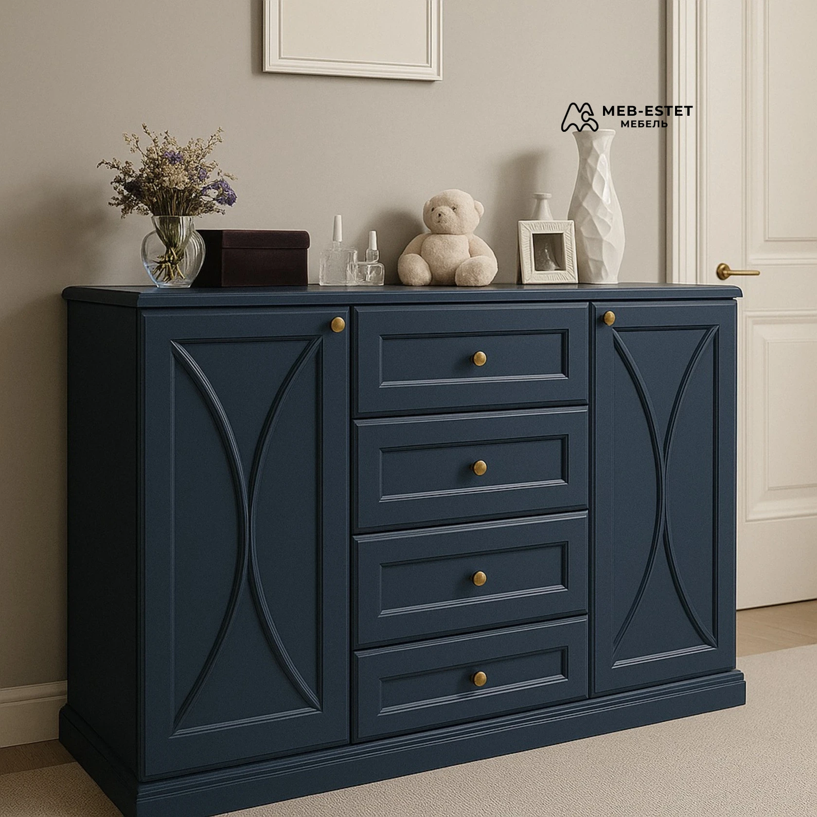 Элегантный комод в неоклассическом духе: матовая эмалевая отделка насыщенного синего цвета, фрезерованные фасады и декоративный карниз. Корпус и фасады — МДФ высокого качества, усиленные стыки и устойчивое основание.