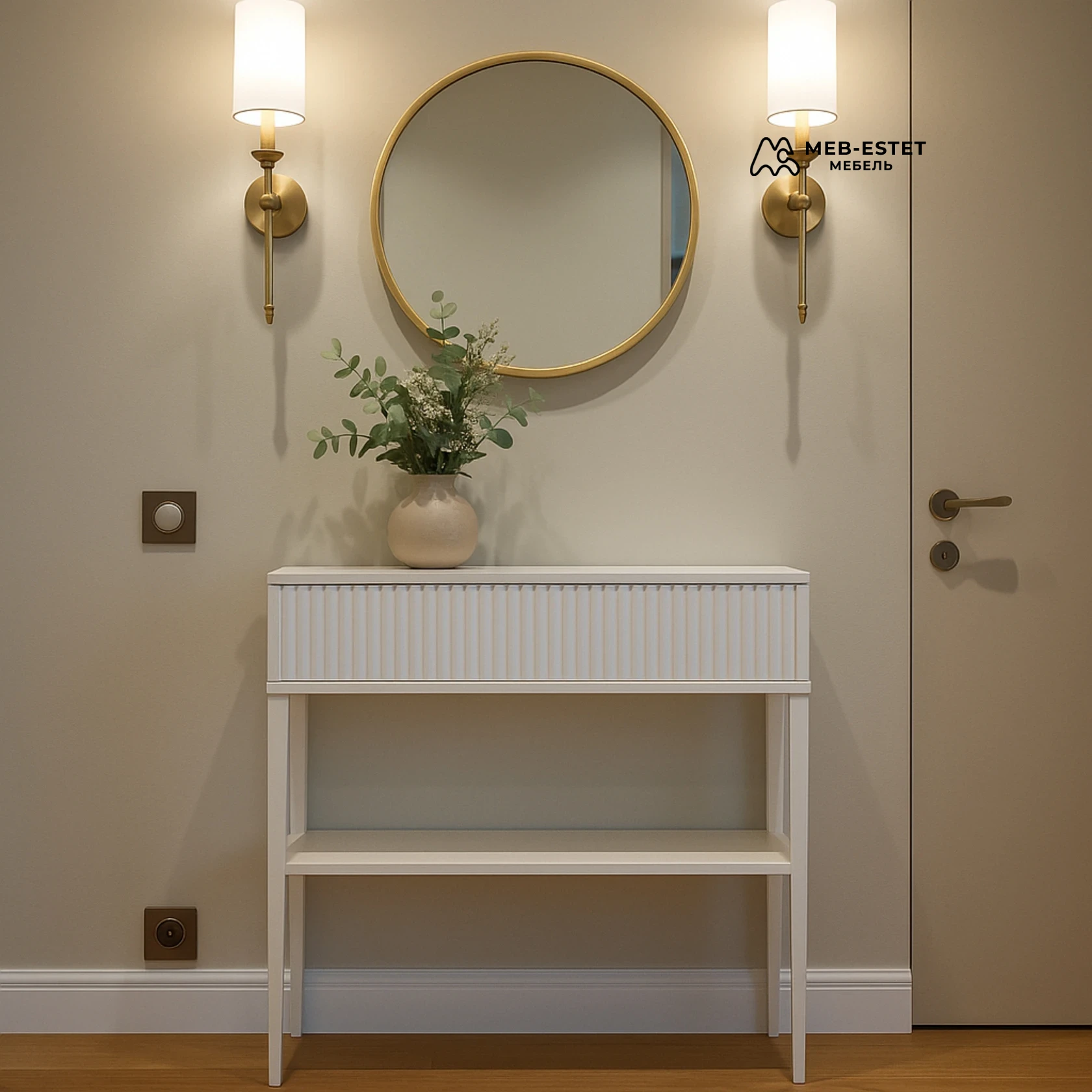 Элегантная консольная тумба в скандинавском стиле с флейтовым (реечным) фасадом. Тонкие ножки и открытая нижняя полка делают изделие лёгким и практичным для прихожей.