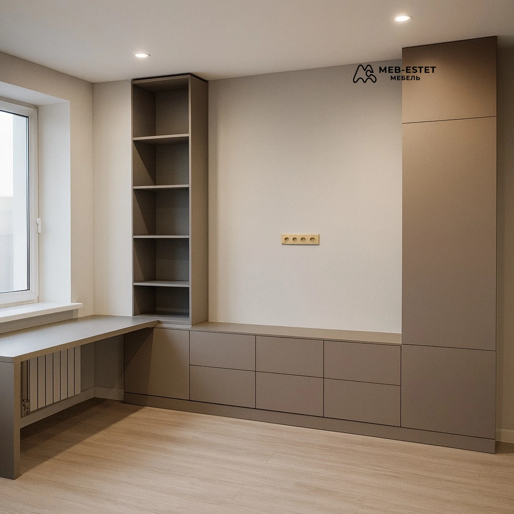 Индивидуальная встроенная мебель премиум-класса: низкие тумбы с ящиками, высокий пенал, открытый стеллаж и рабочая столешница у окна. Матовые МДФ-фасады в тёплом бежево-сером тоне, интегрированные ручки и скрытая фурнитура обеспечивают лаконичный внешний вид и долговечность.
