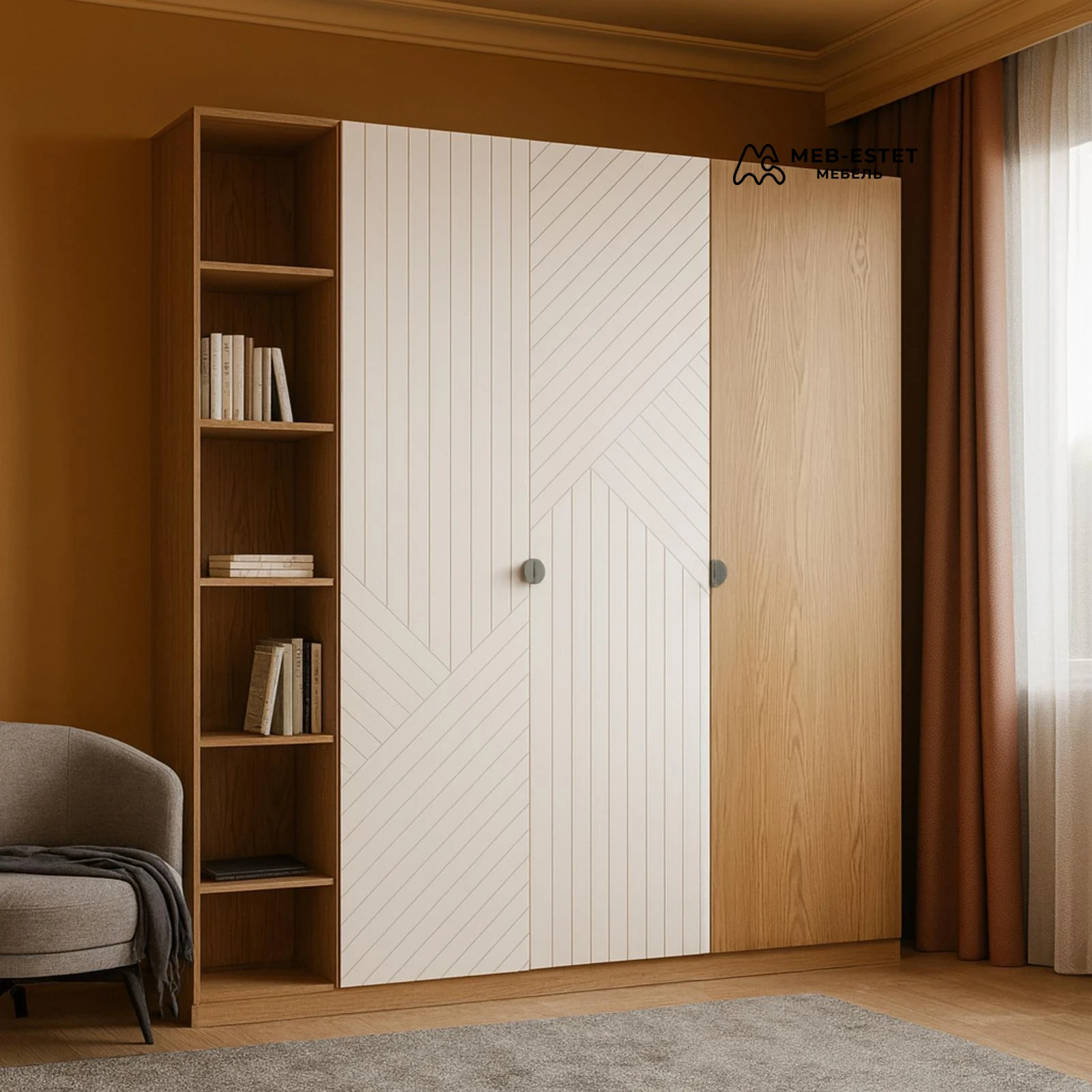 Трёхдверный корпусный шкаф с открытыми боковыми стеллажами — сочетание тёплого шпона дуба и белых фрезерованных МДФ-фасадов. Компактная глубина и высокая вертикальная композиция подходят для спальни или прихожей.