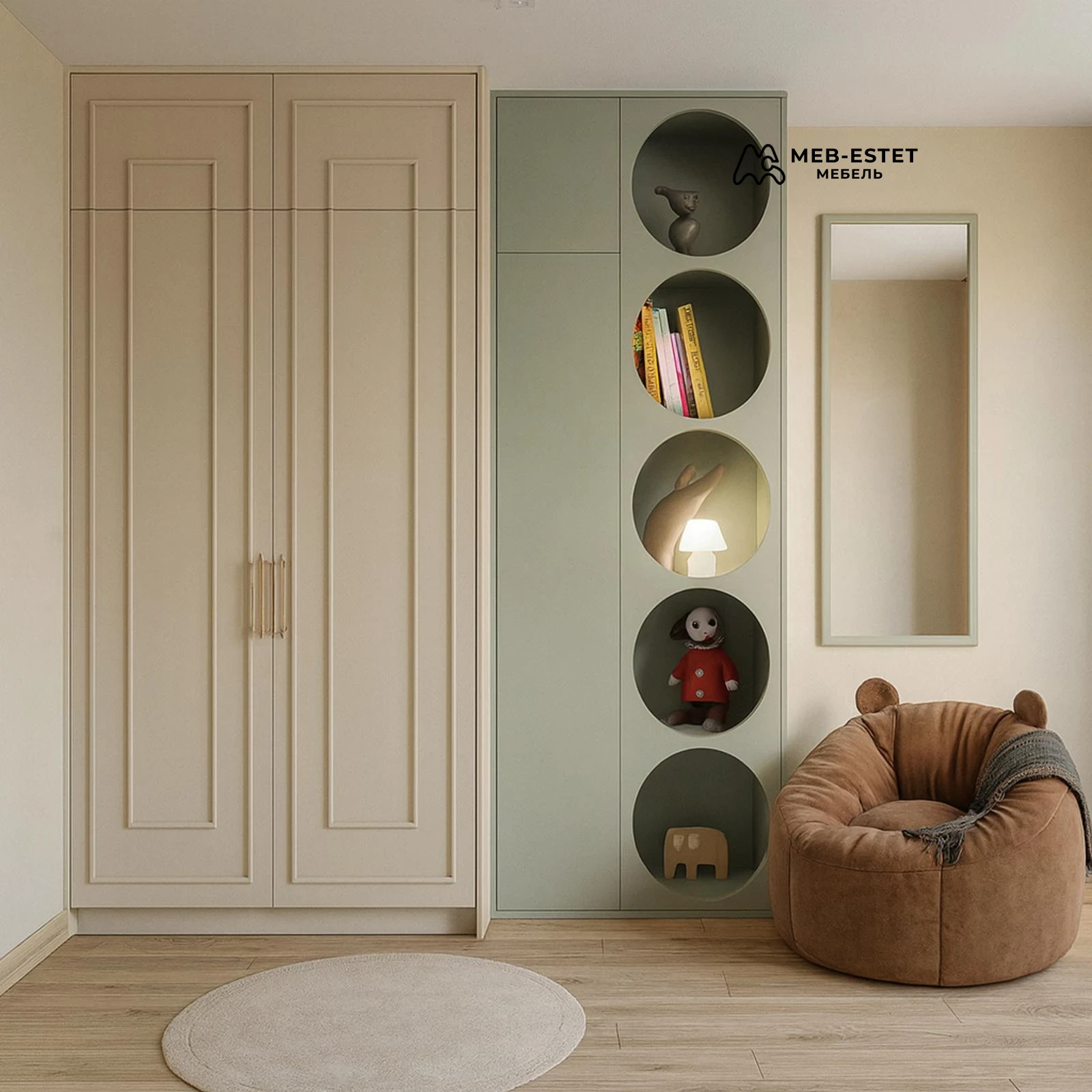 Элегантный корпусный шкаф с декоративными филёнками и вертикальным пеналом со встроенными круглыми нишами. Решение сочетает закрытое хранение для одежды и открытые полки для игрушек и декора.