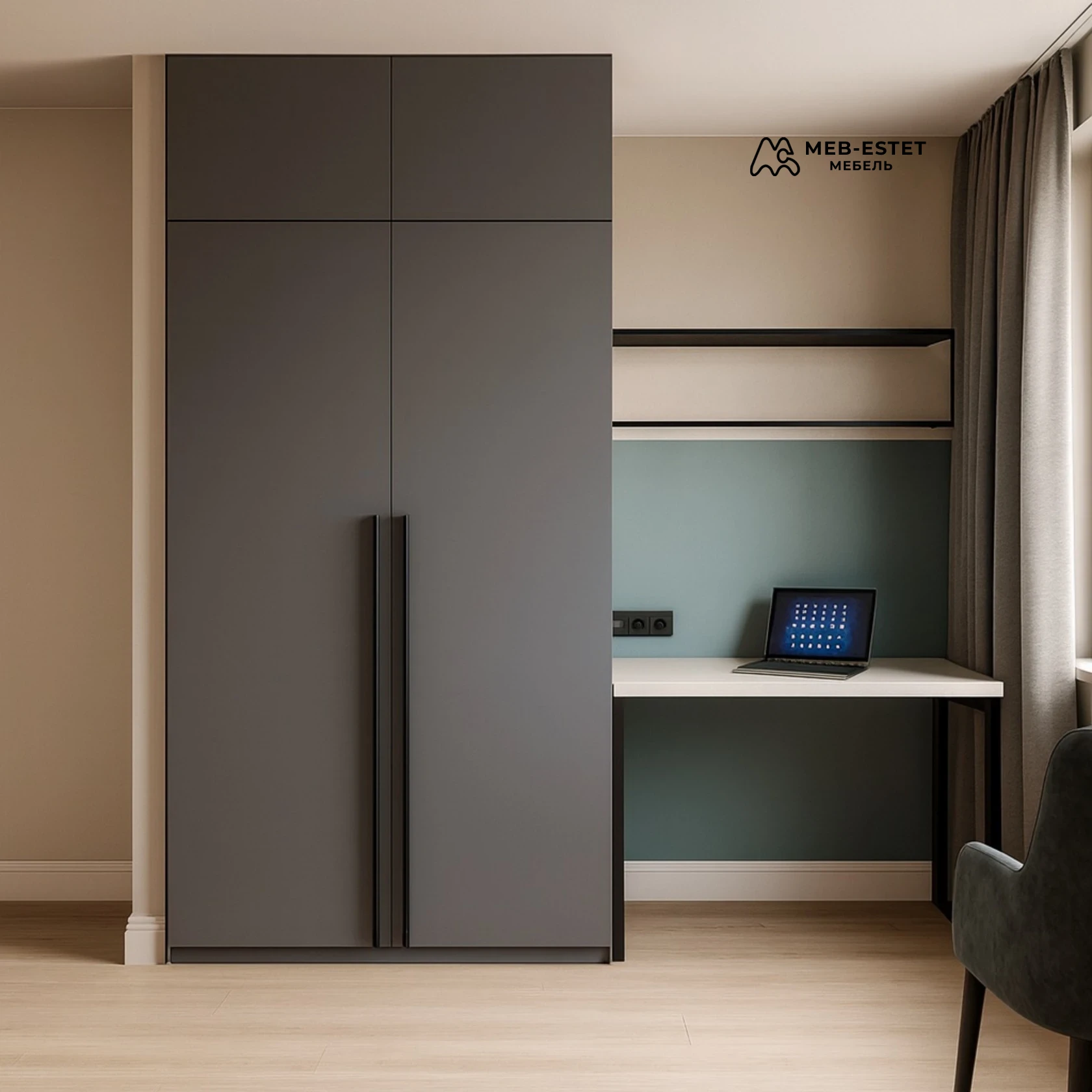 Корпусный шкаф с рабочей нишей — современное решение для спальни или кабинета. Матовое антрацитное покрытие и удлинённые вертикальные ручки подчёркивают минималистичный стиль.