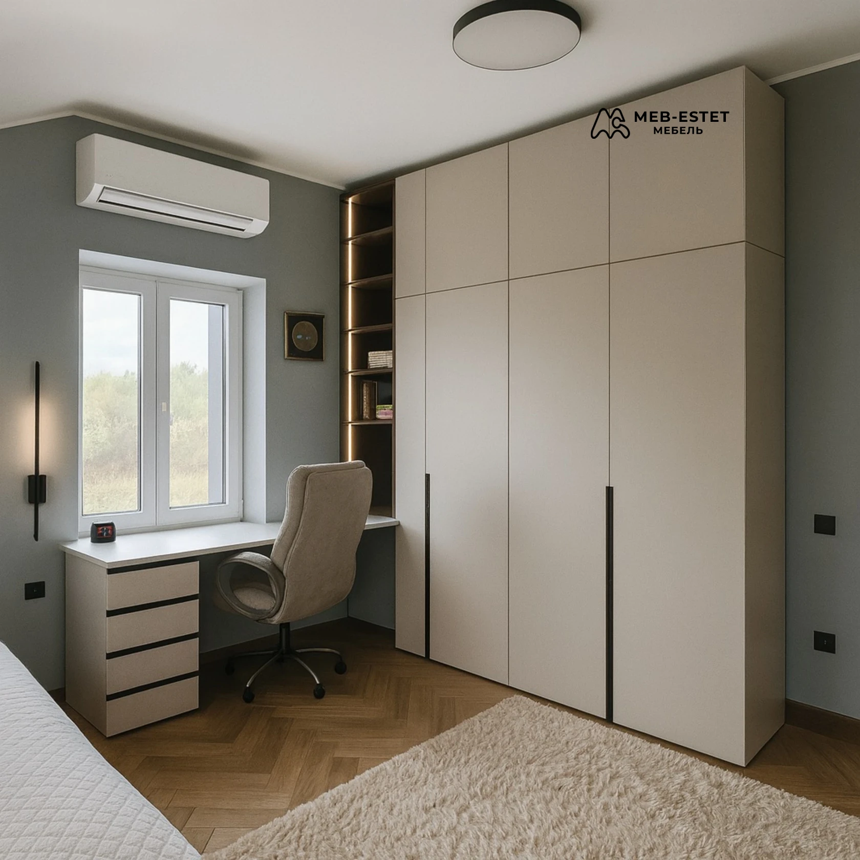 Элегантный корпусный шкаф с интегрированной рабочей зоной — премиальное решение для спальни или кабинета. Матовое бежевое МДФ гармонично сочетается с тёмными нишами из шпона и аккуратными вертикальными ручками, а встроенная LED-подсветка подчёркивает открытые полки.