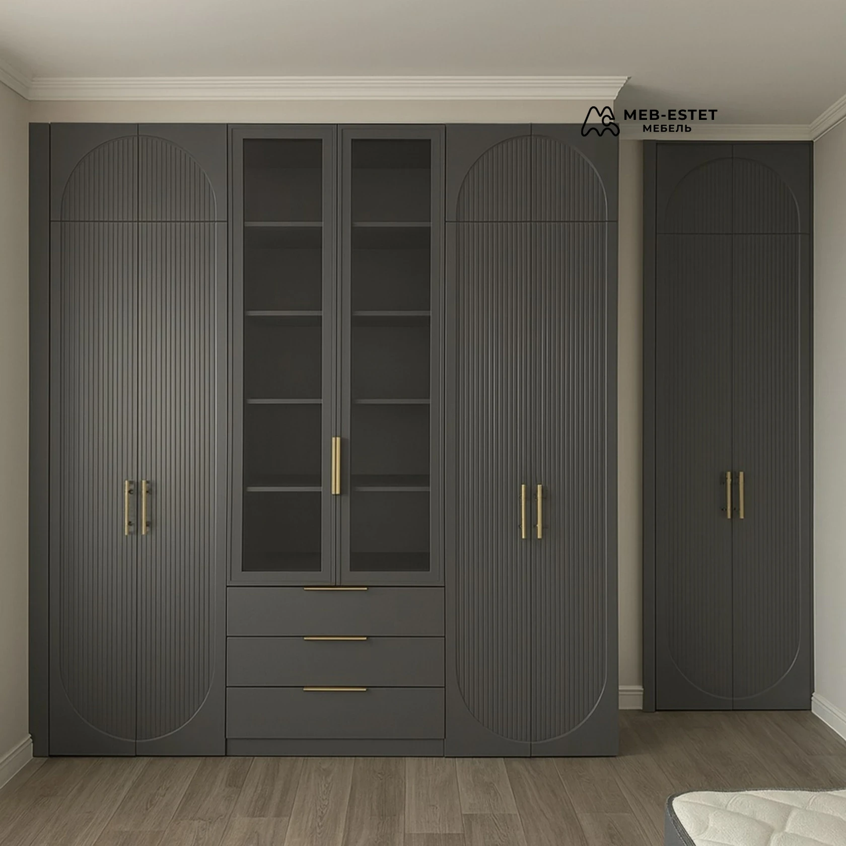 Элегантный корпусный шкаф премиум‑класса с центральной витриной и нижними выдвижными ящиками. Фасады — фрезерованная реечная МДФ с матовой эмалью, встроенные стеклянные двери демонстрируют аккуратно подсвеченные полки. Конструкция — корпусный модуль с усиленными боковинами и скрытыми петлями, направляющие с доводчиками. Идеален для спальни или гостиной, выполняется под индивидуальные размеры и фурнитуру на выбор.