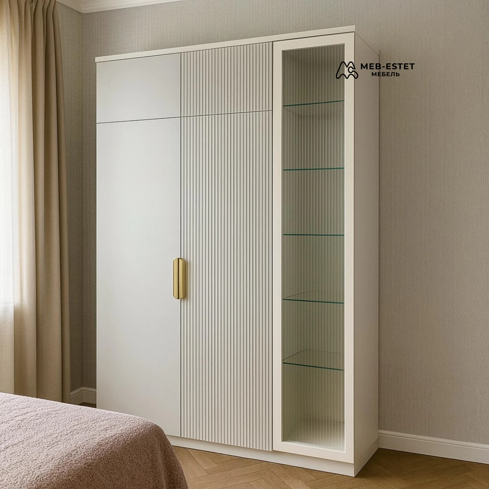 Элегантный корпусный шкаф с витриной в современном стиле. Фасад с реечной текстурой и матовым покрытием, одно распашное полотно и боковая витрина со стеклянными полками для экспозиции. Золотистая ручка подчёркивает премиальный образ.