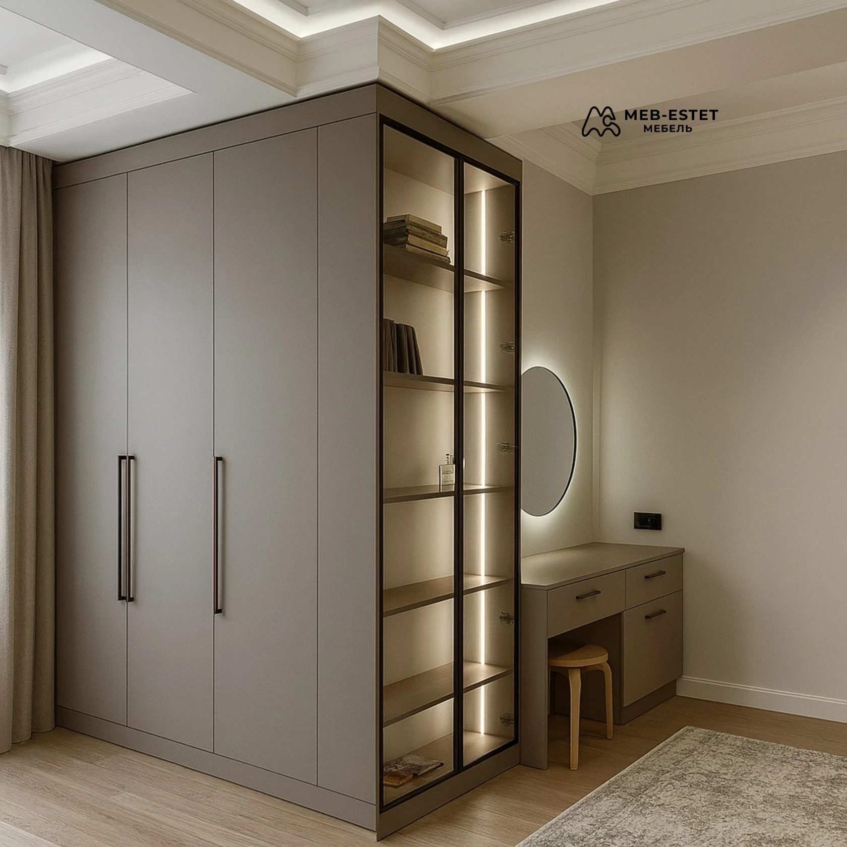 Изящный корпусный шкаф с витринной секцией и скрытой подсветкой, выполненный в тёплых бежево-кремовых тонах. Выполнен под потолок, с ровными матовыми фасадами и прозрачной стеклянной витриной для аксессуаров.