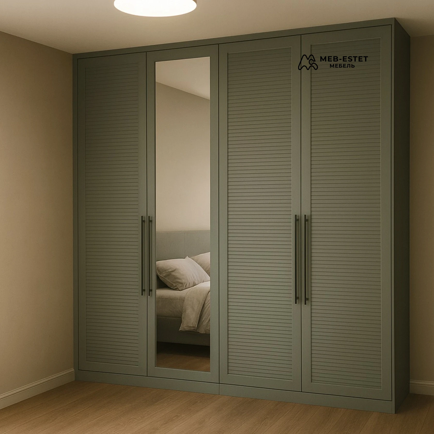 Корпусный шкаф с жалюзийными фасадами и зеркалом — премиальное решение для спальни. Корпус из МДФ/ЛДСП, фасады — окрашенный МДФ с реечным профилем, центральная дверь с зеркалом. Длинные металлические рукояти и доводчики обеспечивают плавное закрытие.