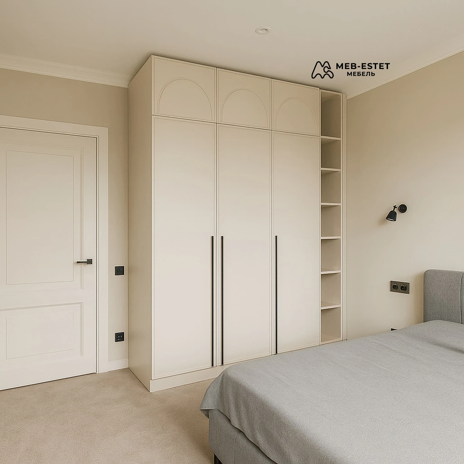 Элегантный корпусный шкаф в неоклассическом стиле с центральной зеркальной дверью и декоративной диагональной фрезеровкой на фасадах. Выполнен в матовой крашенной МДФ-отделке с верхним карнизом и латунными ручками — сочетание аккуратной мебели и премиальной отделки.