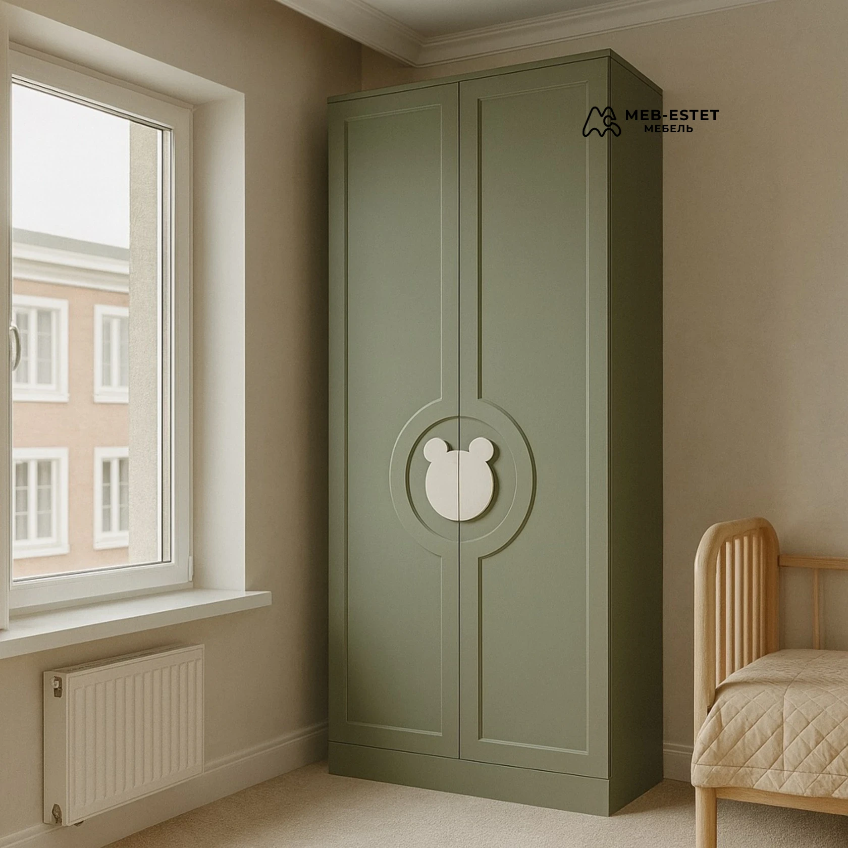 Элегантный платяной шкаф для детской комнаты — корпусный, на две распашные двери. Фасады из крашеного МДФ в матовой эмали с фрезерованной филёнкой и декоративной ручкой-медвежонком. Внутри предусмотрены полки и штанга, возможна антресоль и выдвижные ящики по индивидуальному заказу.