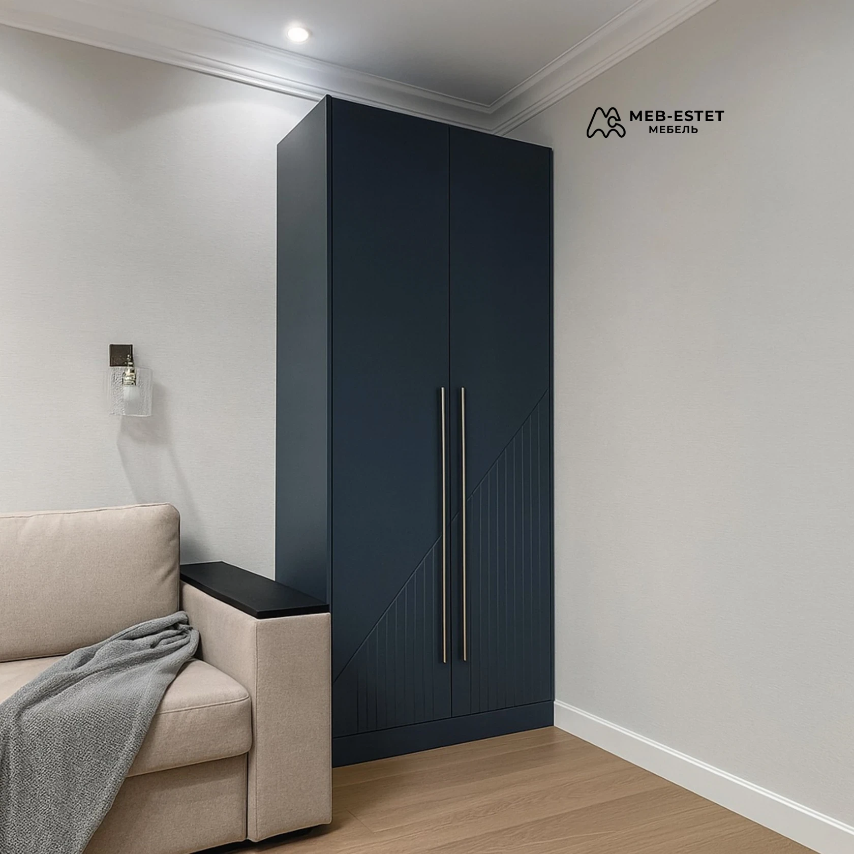 Стильный узкий распашной шкаф для гостиной или прихожей, выполнен под заказ с акцентом на премиальную отделку и продуманную конструкцию. Корпус и фасады — окрашенный МДФ с матовой эмалью, тонкая фрезеровка создаёт диагональный ритм.