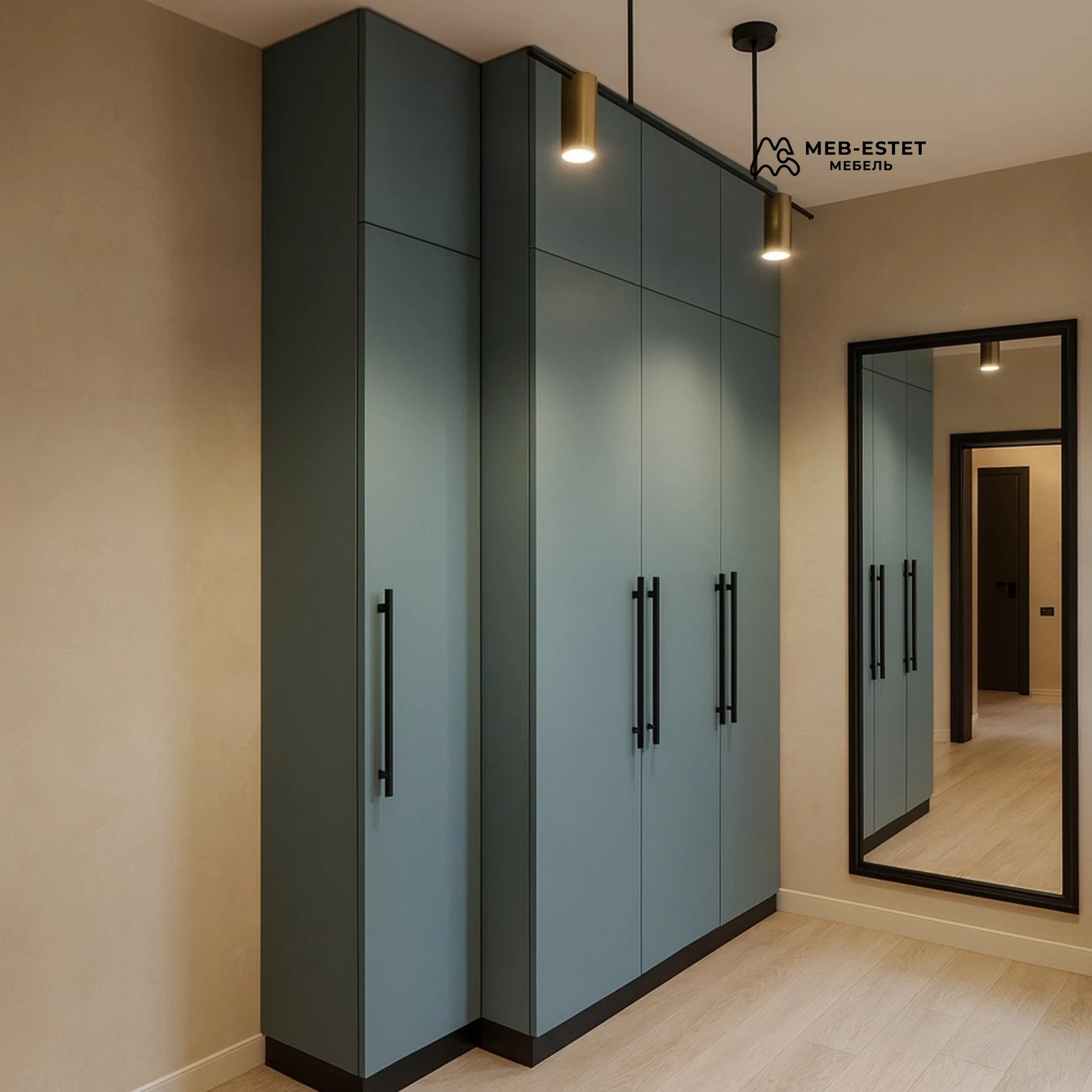 Корпусный распашной шкаф для прихожей — оптимальное решение для хранения верхней одежды и обуви с акцентом на премиальное исполнение. Фасады — покрашенный МДФ в матовом цвете, длинные черные ручки и скрытые петли обеспечивают лаконичный современный вид.