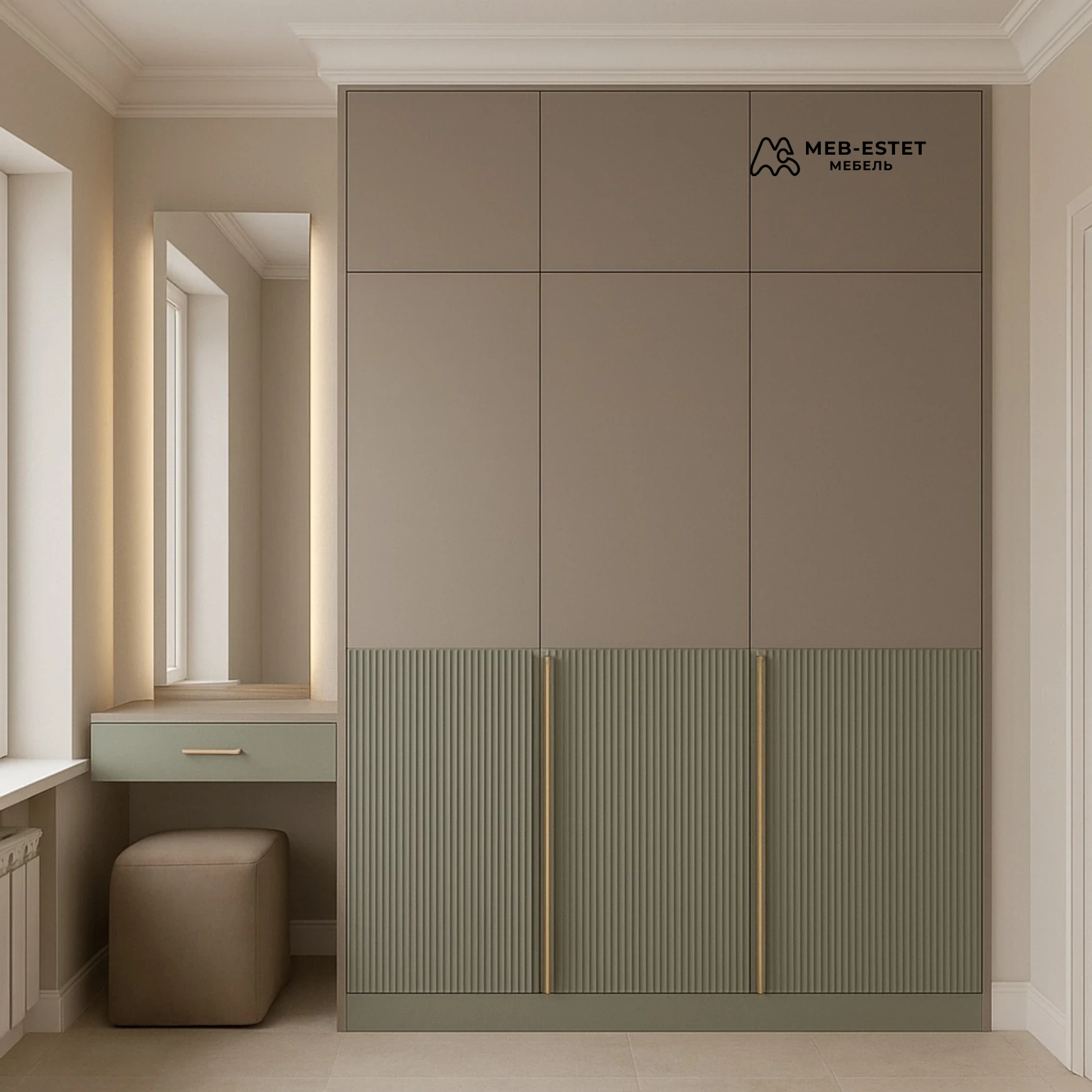 Элегантный корпусный шкаф по индивидуальным размерам — идеальное решение для прихожей или спальни. Верхняя часть — гладкие матовые фасады, нижняя — рельефная реечная поверхность в спокойном зелёном тоне с тонкими золотистыми ручками.