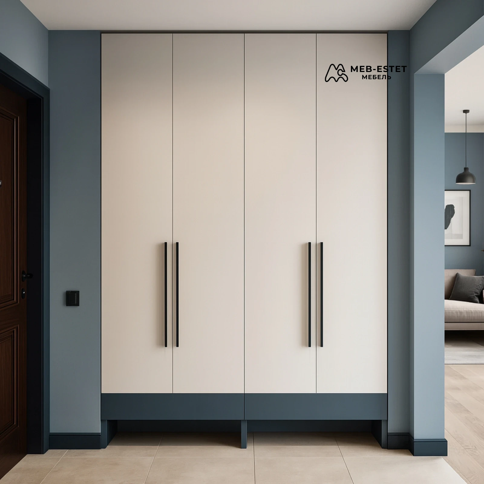 Корпусный распашной шкаф для прихожей премиум-класса. Матовые фасады из МДФ с эмалью, контрастный цоколь и длинные металлические ручки придают строгий современный вид. Внутреннее наполнение — штанга для одежды, полки для обуви и несколько выдвижных ящиков.