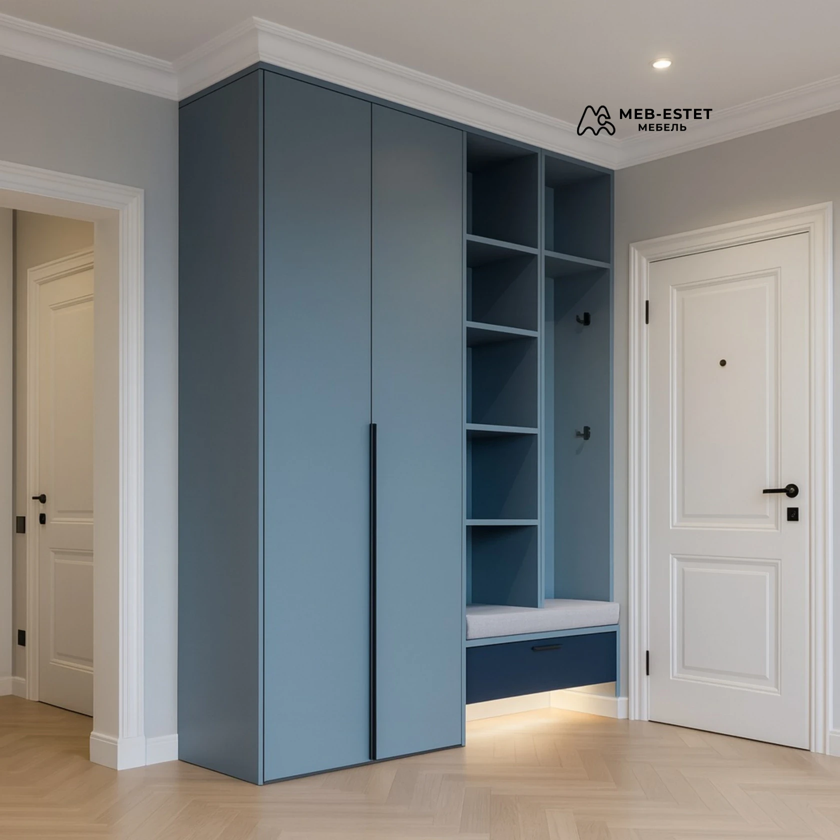 Стильный встроенный шкаф для прихожей — функциональное решение под заказ для компактного холла. Выполнен в матовой эмали синего оттенка, сочетает распашные фасады и открытую нишу с полками и сиденьем.
