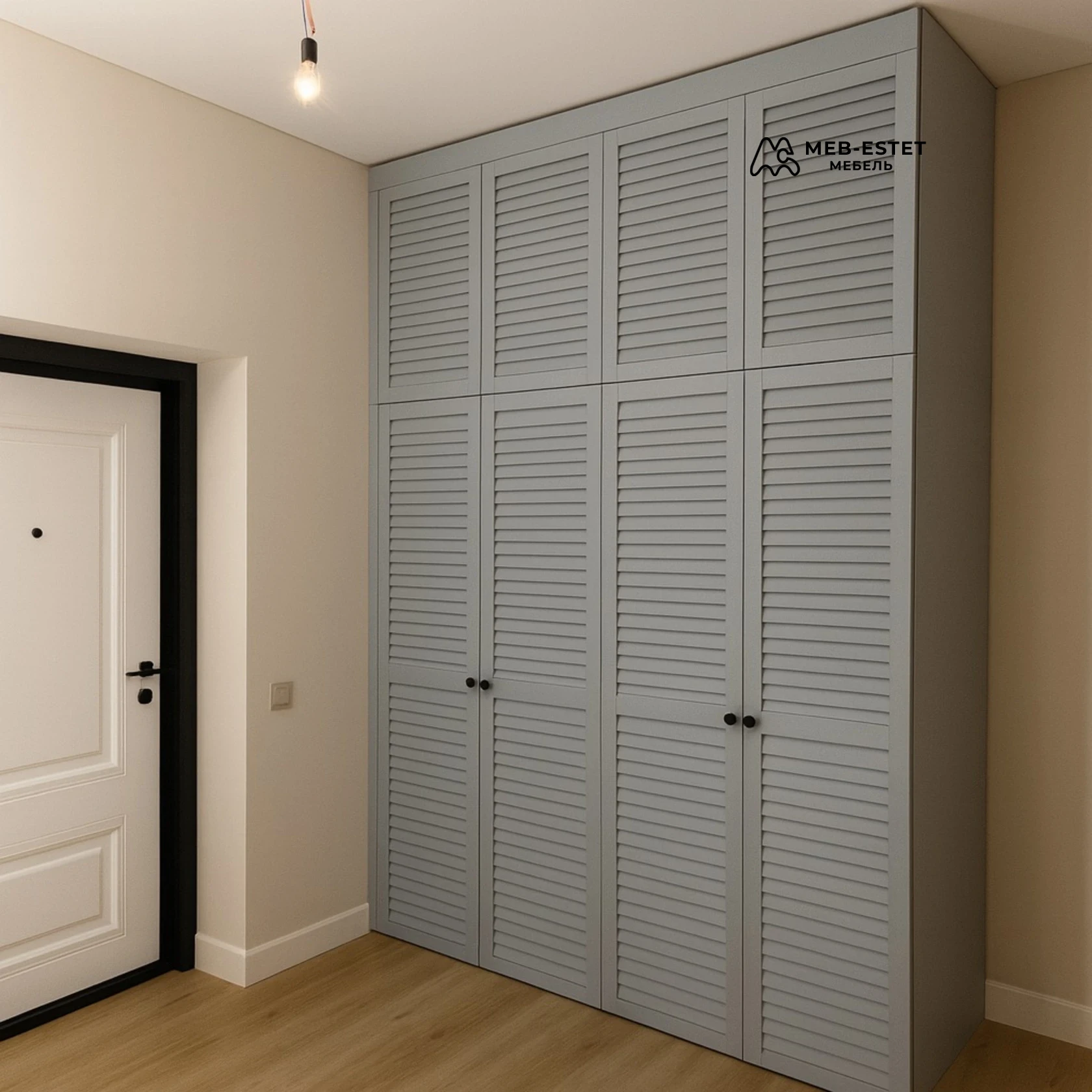 Высокий корпусный шкаф с жалюзийными дверцами — практичное и эстетичное решение для прихожей. Серый матовый фасад из МДФ обеспечивает аккуратный вид и хорошую воздухообменность в отделениях.