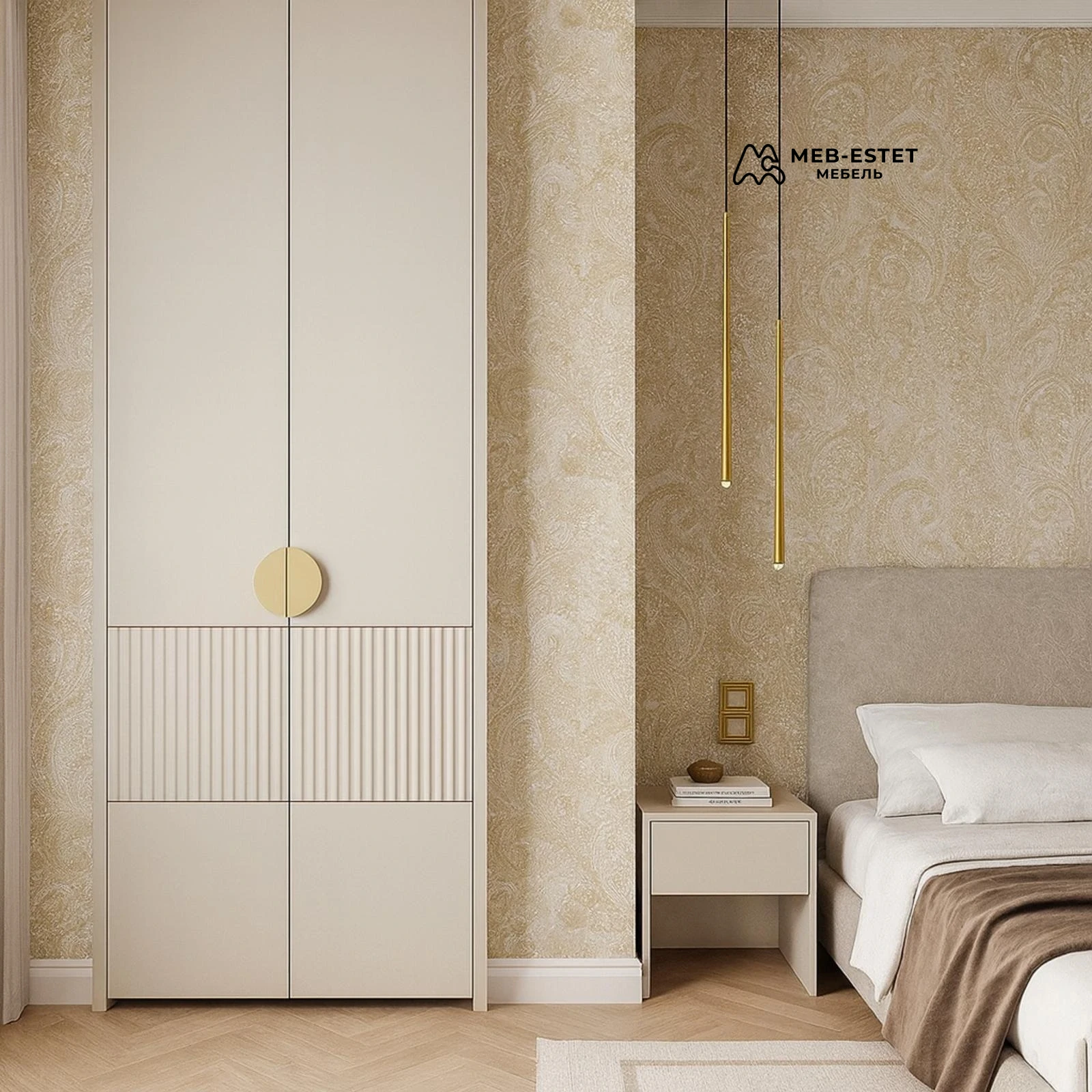 Элегантный корпусный распашной шкаф для спальни в кремовом оттенке. Фасад сочетает гладкие поверхности и реечную панель, которая задаёт текстуру и глубину образа. Центральная круглая латунная ручка подчёркивает премиальность и акцентирует дизайн.