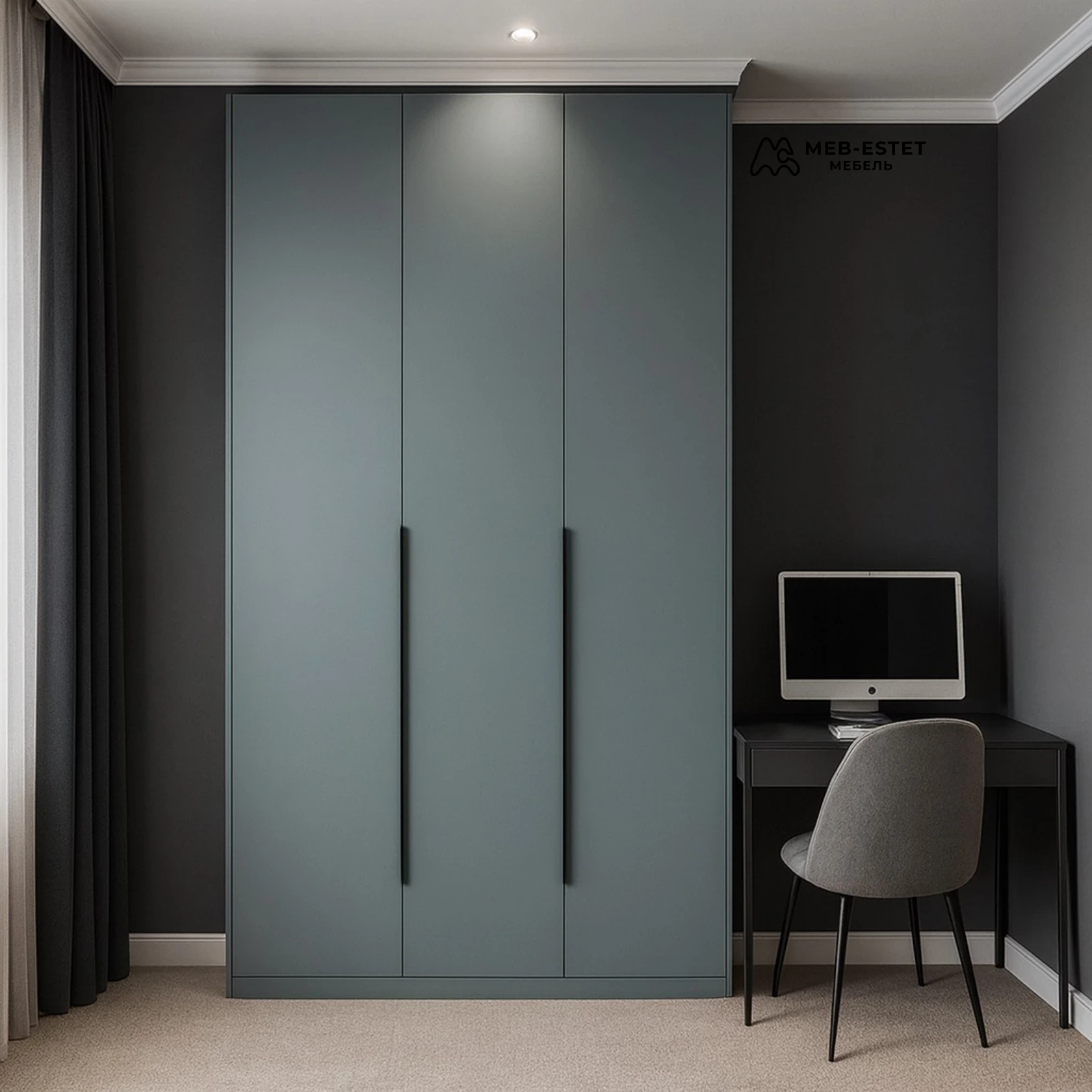 Высокий корпусный распашной шкаф премиум-класса в лаконичном матовом серо-синем оттенке. Установлены длинные контрастные ручки, ровные зазоры по дверям, стойкая эмаль на МДФ фасадах.