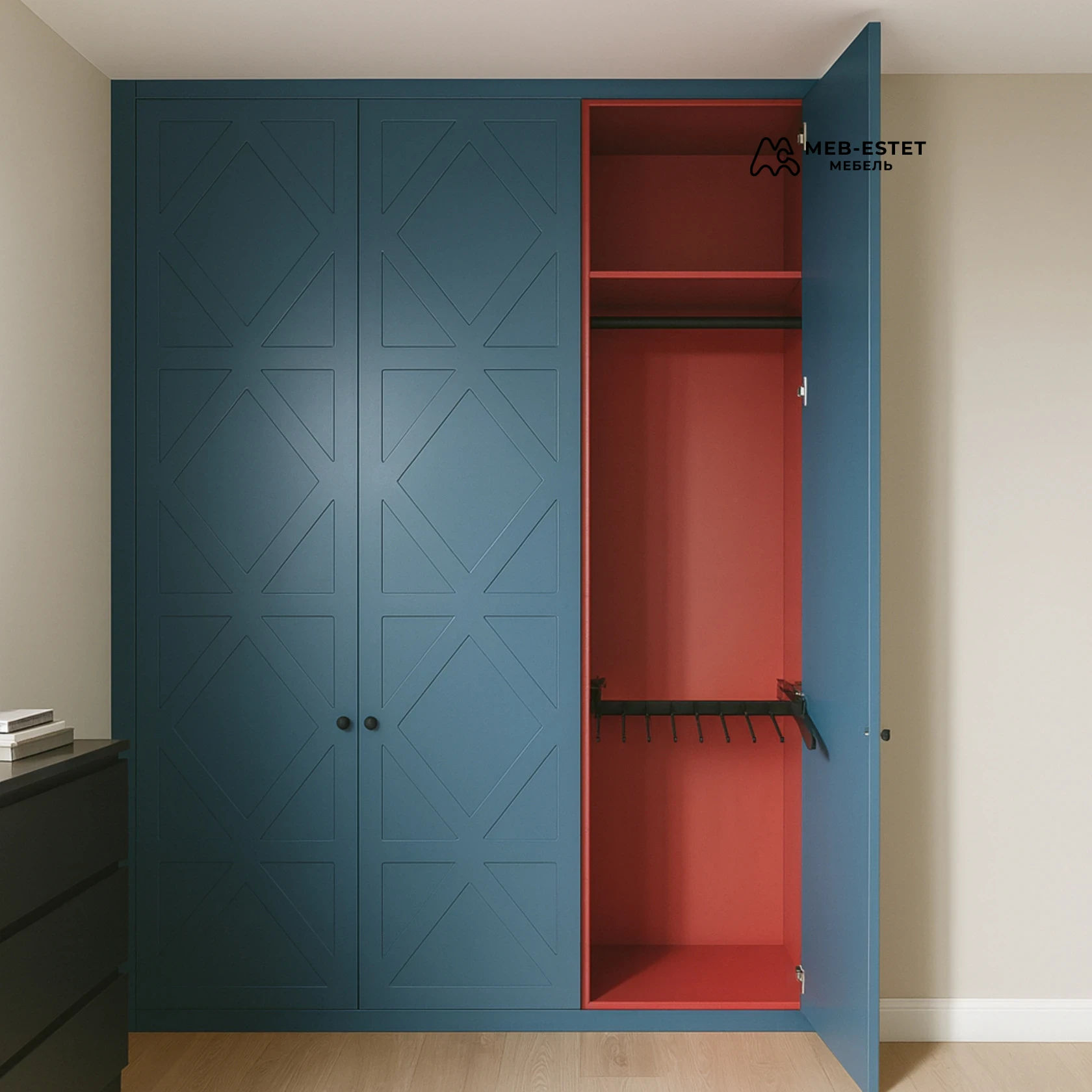 Современный корпусный распашной шкаф в матовом синем исполнении с фрезерованным геометрическим рисунком на фасадах. Контрастный красный интерьер визуально зонирует полки и секцию для одежды.