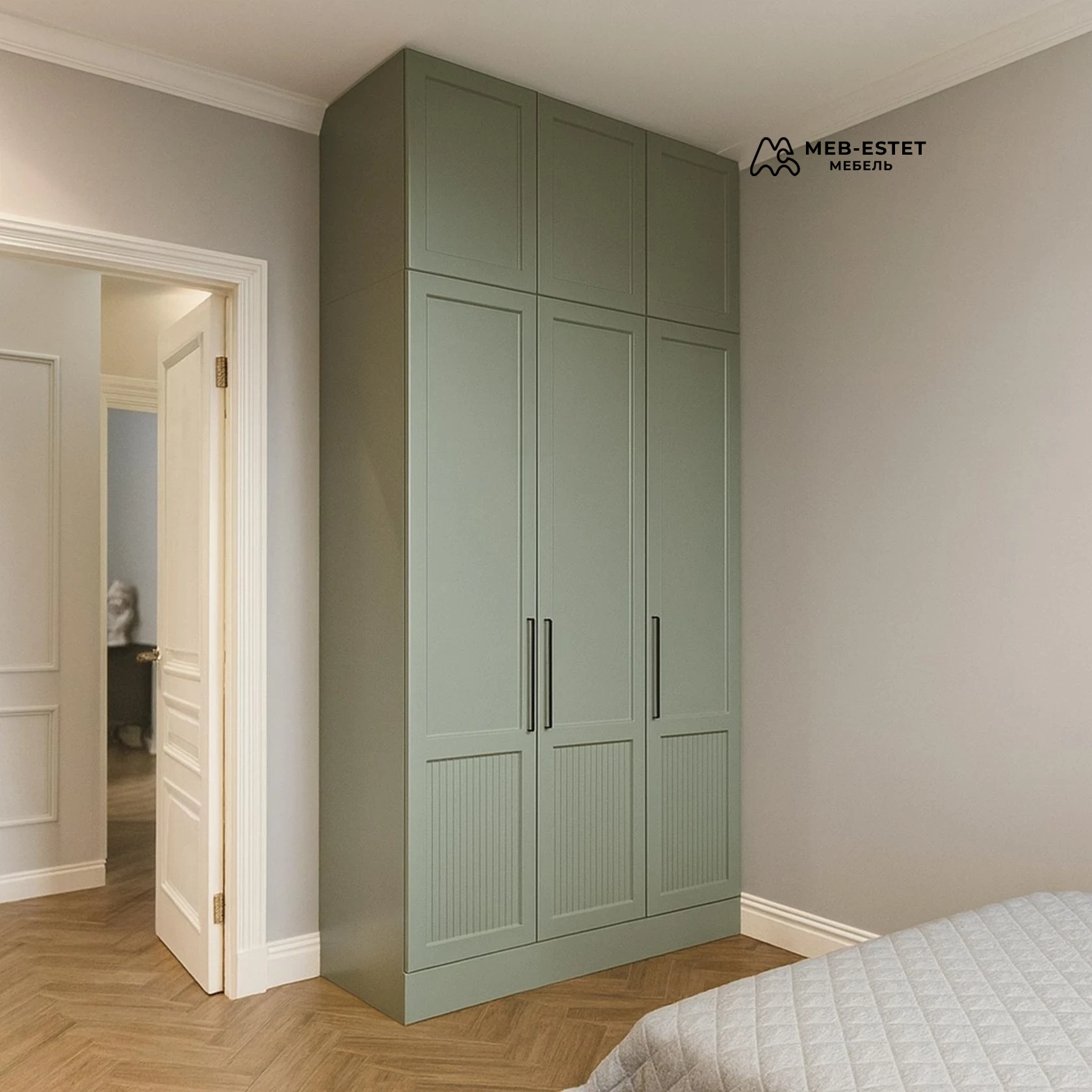 Высокий корпусный шкаф под заказ в спокойном зелёном тоне — решение для компактной спальни. Фасады с рамочными филёнками и нижней реечной вставкой придают изделию неоклассический характер, а длинные чёрные ручки подчёркивают современную эстетику.