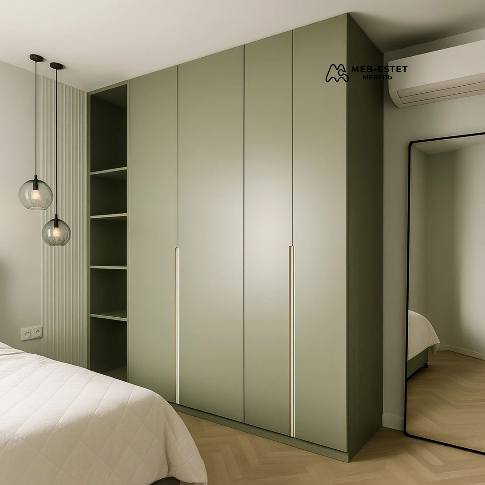 Стильный корпусный шкаф премиум-класса для спальни в спокойном зелёном оттенке. Четкие ровные фасады из МДФ с матовой эмалью, высокие распашные двери и узкие металлические ручки формируют сдержанный современный образ.