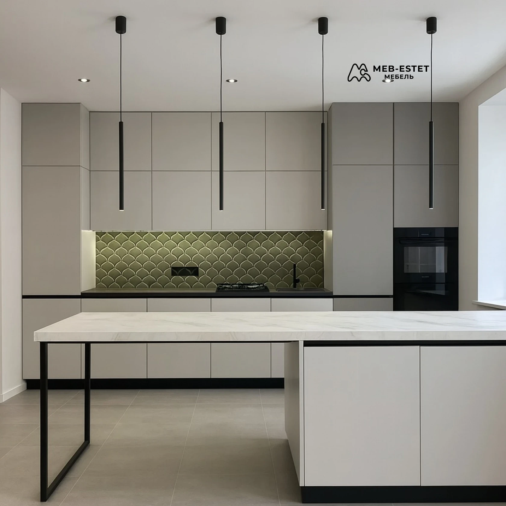 Современная кухня по индивидуальным размерам: чистые линии, скрытые ручки и матовые фасады. Решение оптимально для тех, кто ценит минимализм и функциональность.