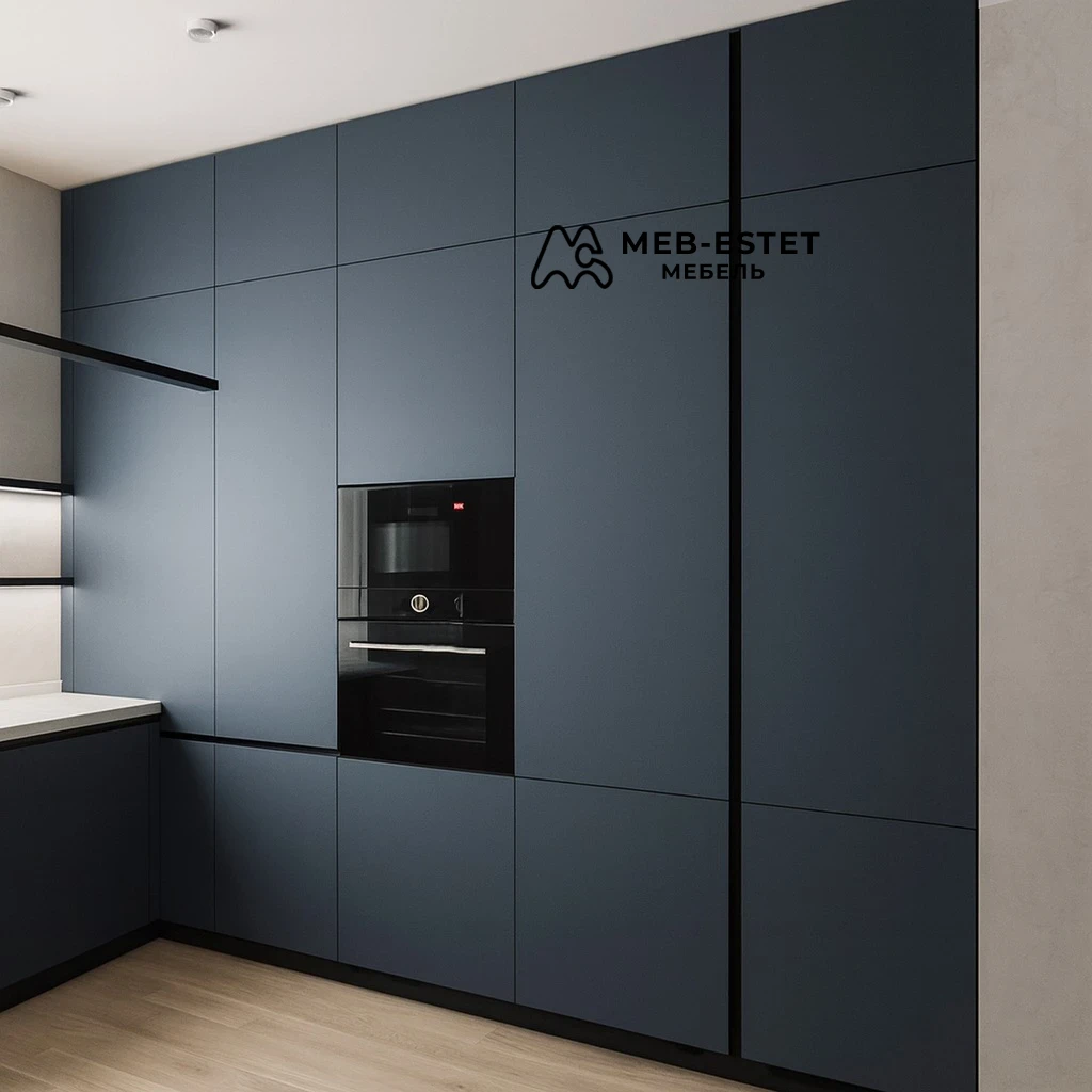 Современная встроенная кухня в минималистском стиле: ровные матовые фасады без видимых ручек, интегрированная духовая панель и модульная конструкция до потолка. Решение направлено на аккуратное встраивание техники и максимизацию полезного объёма.