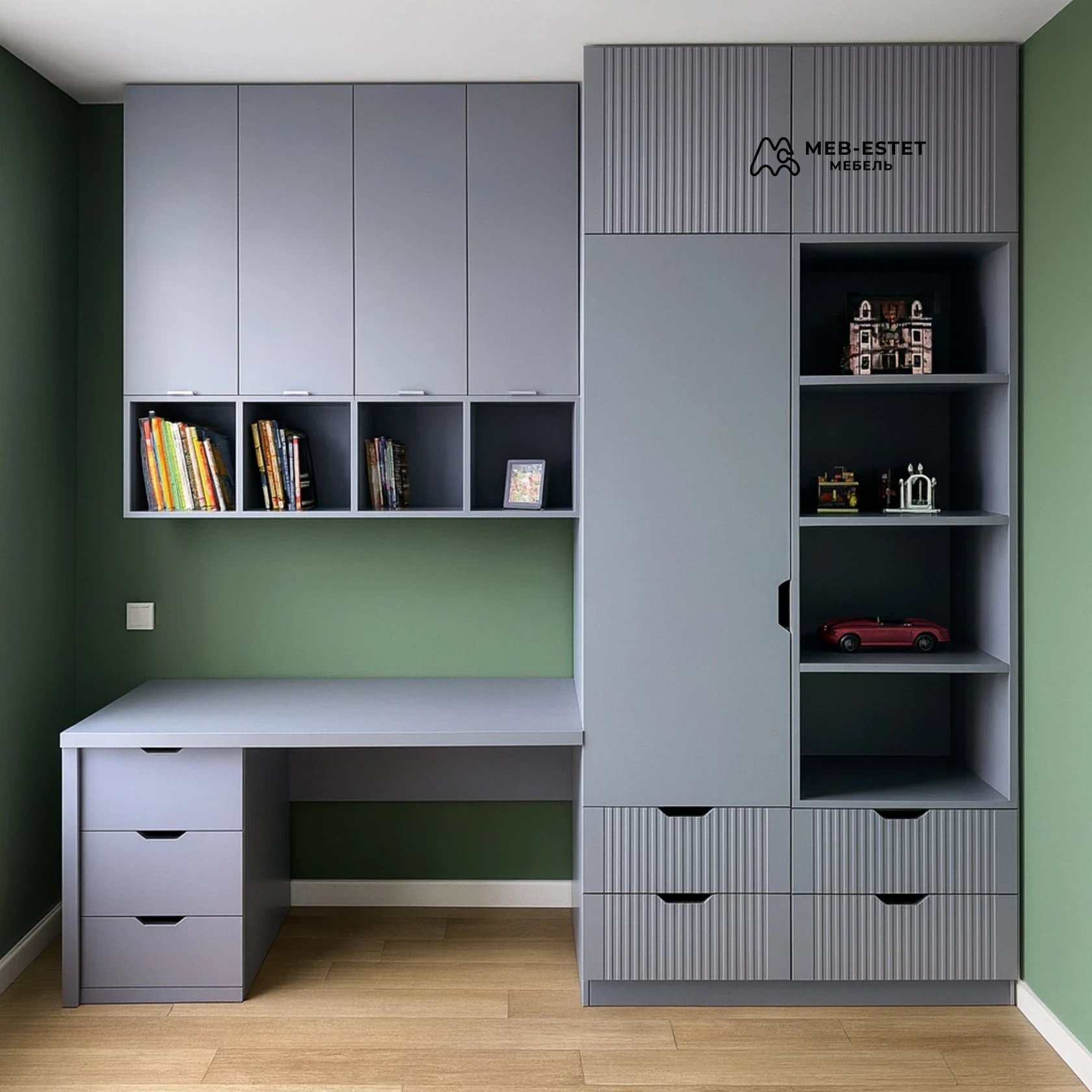 Модульная рабочая зона с высоким шкафом, открытыми секциями и приставным столом. Фасады — матовый серый МДФ с реечной (реечный) вставкой, интегрированные вырезы-ручки и аккуратные скрытые направляющие.