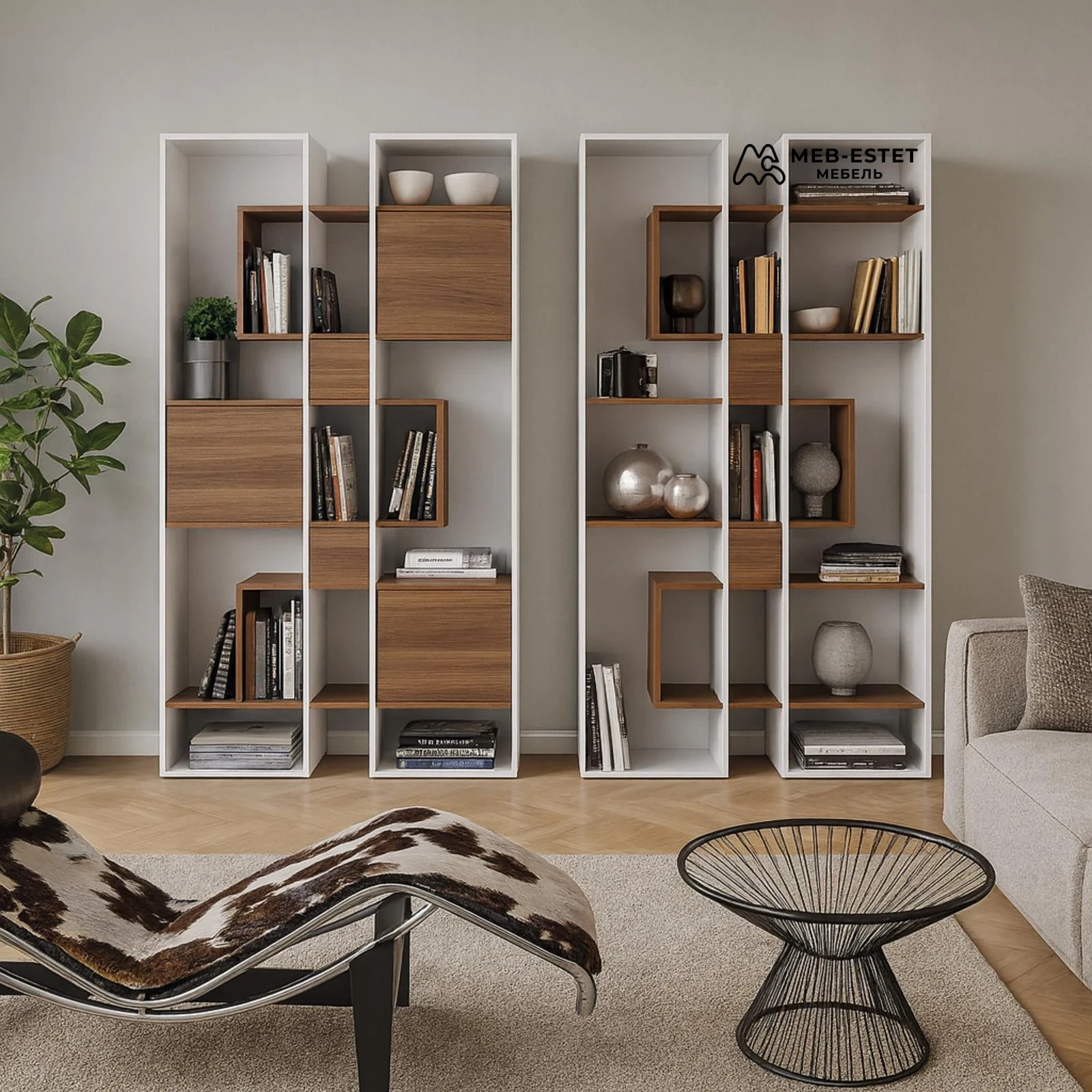Современная модульная стеллажная система из белого ЛДСП с элементами шпона. Идеально подходит для гостиной или кабинета: сочетает открытые полки и закрытые кубы для аккуратного хранения книг и декора.