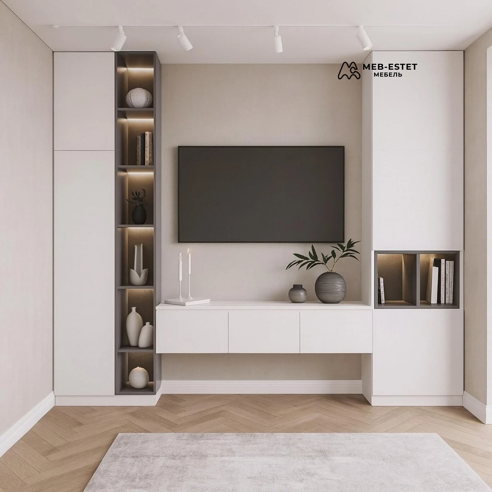 Современная модульная стенка под ТВ в минималистичном стиле. На фото — сочетание двух высоких шкафов, узкого стеллажа с подсветкой и подвесной тумбы с тремя фасадами. Выполнена в матовом белом МДФ с контрастными нишами-шпо́ном.