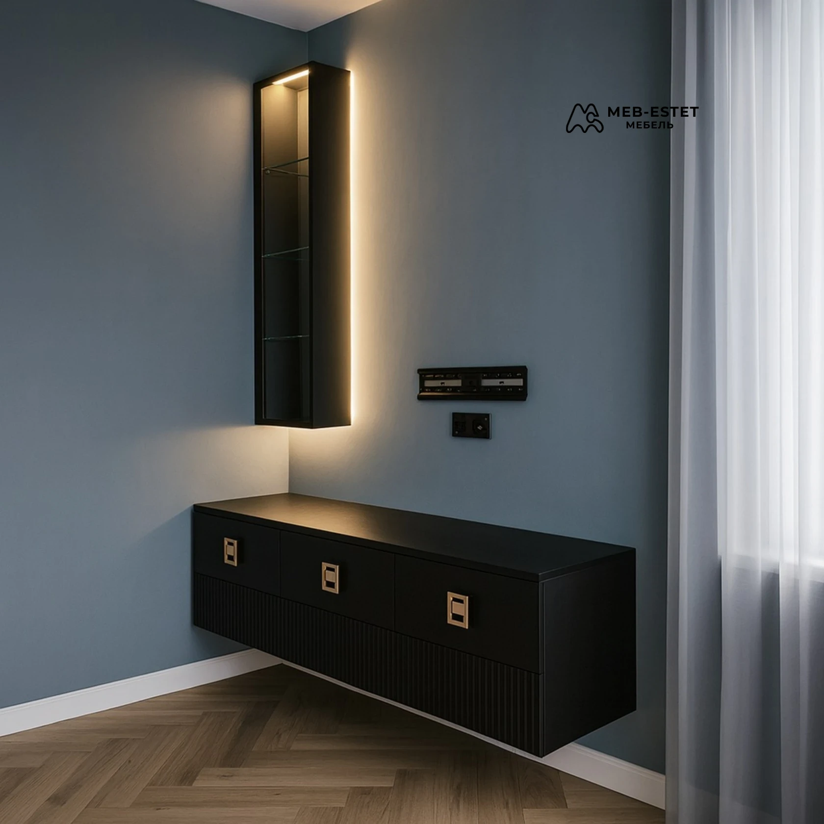 Навесная консоль с витриной в минималистичном стиле: матовый чёрный корпус из МДФ/ЛДСП, реечная декоративная панель на фасаде и квадратные латунные ручки. Витрина с закалёнными стеклянными полками и встроенной тёплой LED-подсветкой. Конструкция фиксируется скрытым креплением к стене, ящики на направляющих с доводчиками. Подходит для гостиной или прихожей, изготовим по индивидуальным размерам и подбору фурнитуры.