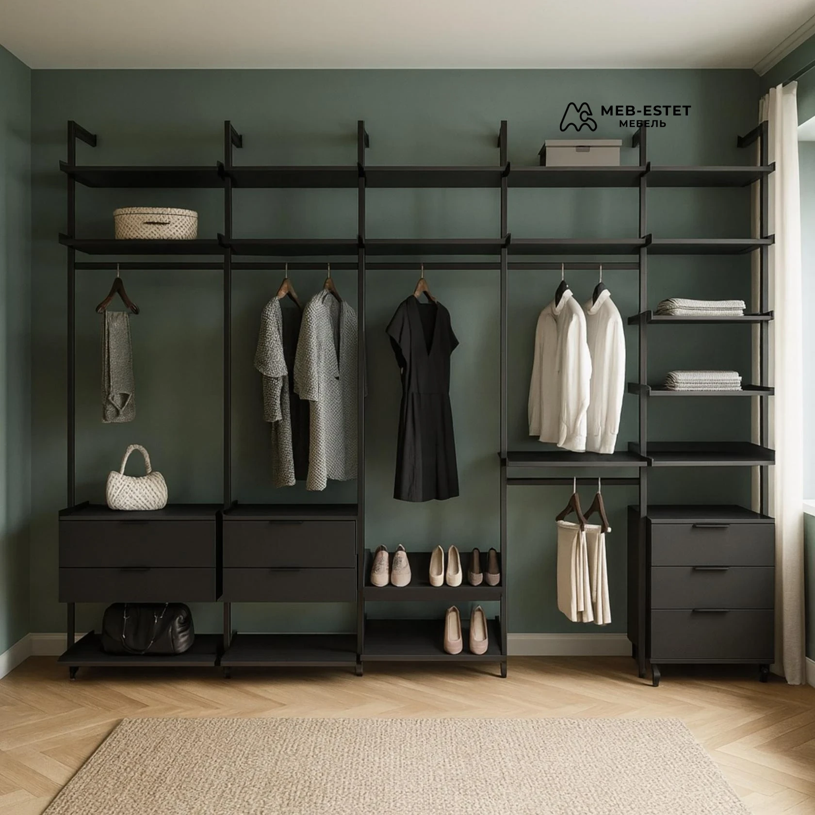 Современная открытая гардеробная на заказ, выполненная в минималистичной стилистике. Черный металлический каркас и матовые фасады МДФ подчеркивают премиальный характер конструкции.