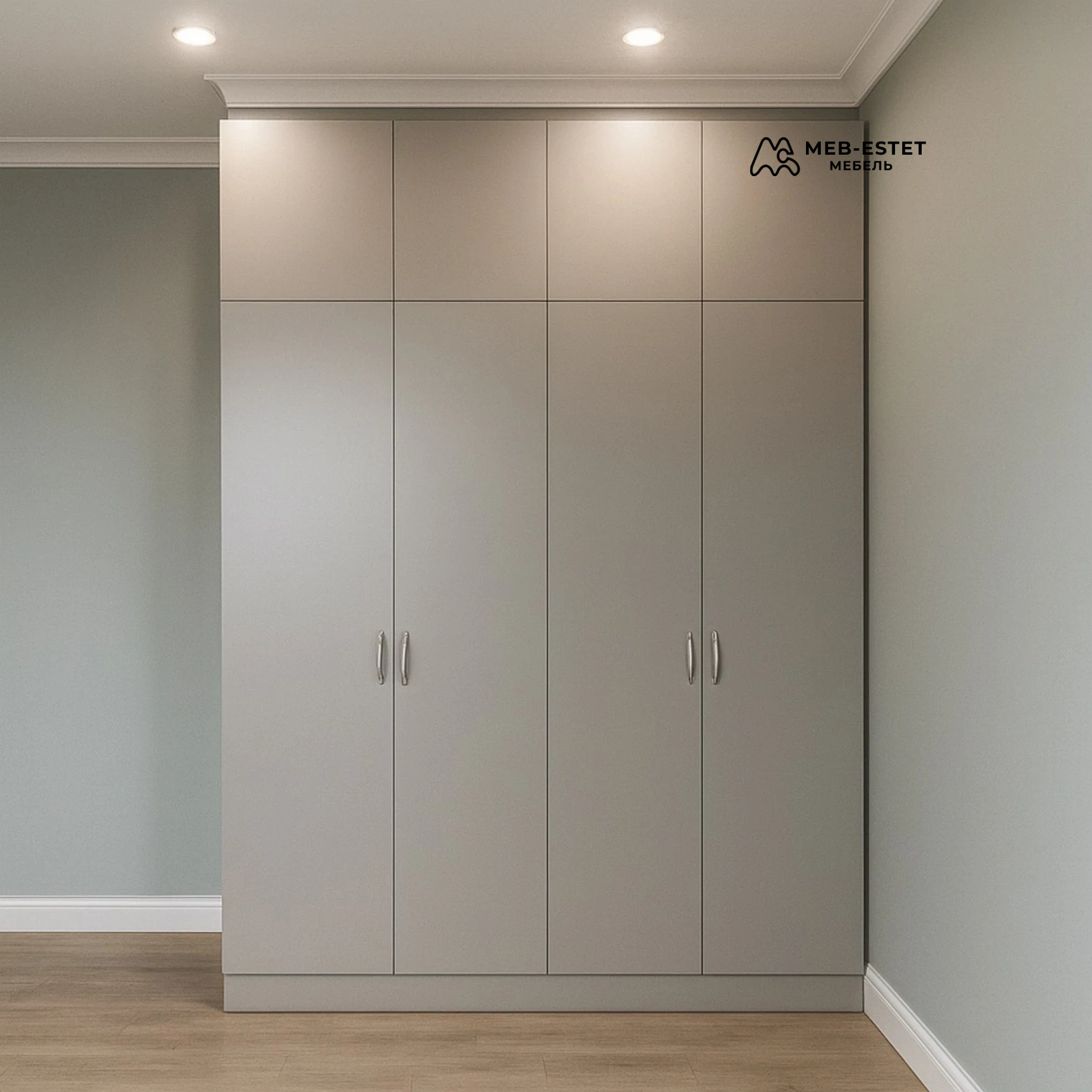 Высокий платяной шкаф с антресолями — решение для аккуратного хранения одежды в спальне. Фасады — гладкий матовый МДФ в бежево‑серой гамме, скрытые пазы стыка и утопленные петли обеспечивают лаконичный профиль.