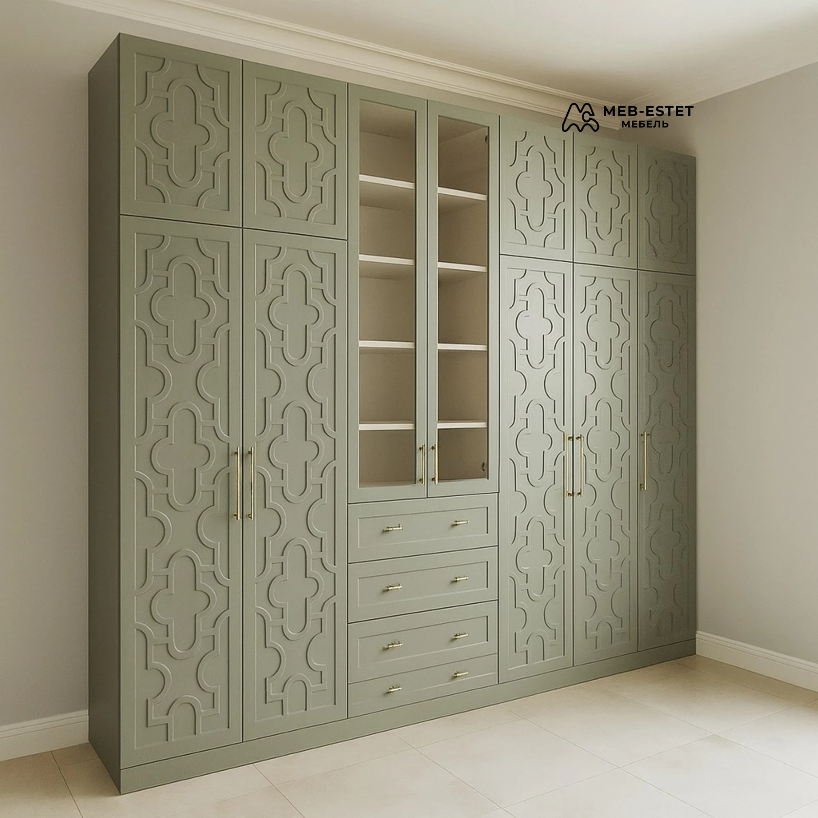Премиальный корпусный платяной шкаф на заказ с центральной витриной. Фасады — фрезерованный МДФ, матовая покраска в спокойный зелёный тон; декоративный рельеф выполнен по шаблону, придаёт глубину и фактуру. Корпус из влагоустойчивой плиты, стойкие к износу направляющие и скрытые доводчики на дверях и ящиках.