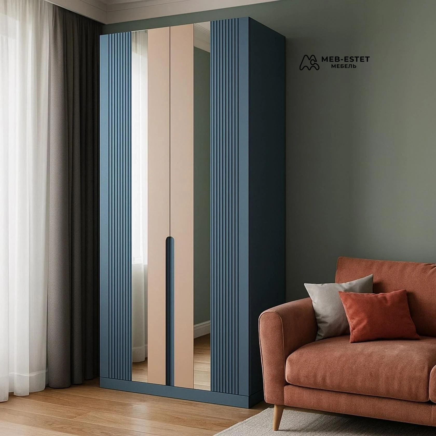 Высокий корпусный платяной шкаф в современном стиле, выполнен с комбинированными фасадами — рифлёная МДФ-панель в глубоком синем тоне и центральная бежево-песочная вставка со встроенным зеркалом. Идеален для спальни или гостиной, экономит пространство и выглядит как предмет интерьера.
